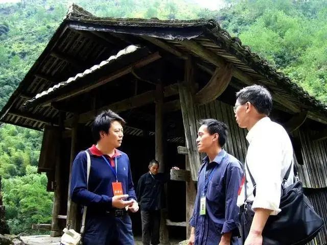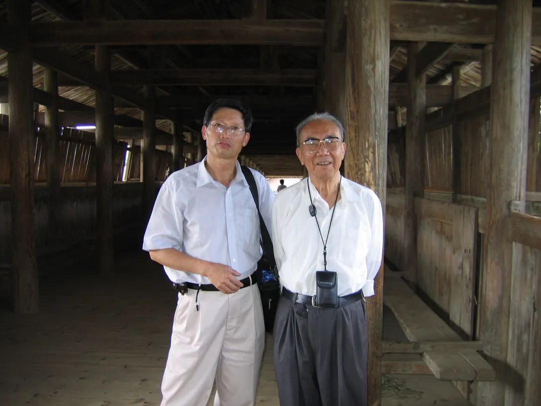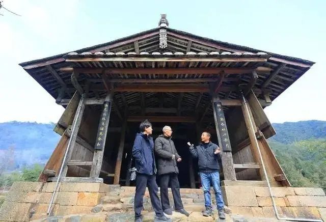 龔迪發(fā)(左一)與唐寰澄先生在調(diào)研木拱廊橋