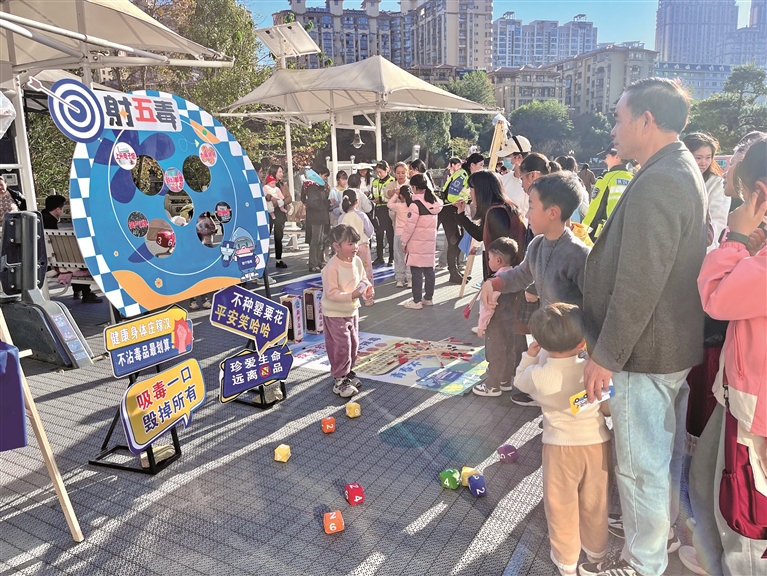 活動(dòng)現(xiàn)場(chǎng)氣氛熱烈,多個(gè)寓教于樂的互動(dòng)體驗(yàn)區(qū)吸引了眾多孩子踴躍參與。“投沙包射五毒”“識(shí)毒辨毒投壺”“禁毒套圈”等特色體育項(xiàng)目,巧妙將禁毒元素融入游戲環(huán)節(jié)。孩子們?cè)跉g樂競(jìng)技中,直觀感受“遠(yuǎn)離毒害”的理念——投沙包時(shí)奮力擲向“毒魔”標(biāo)靶,投壺前需準(zhǔn)確辨識(shí)毒品類型并回答禁毒問題。游戲成功的背后,是對(duì)禁毒警示的深刻記憶,趣味互動(dòng)讓防毒意識(shí)悄然扎根。