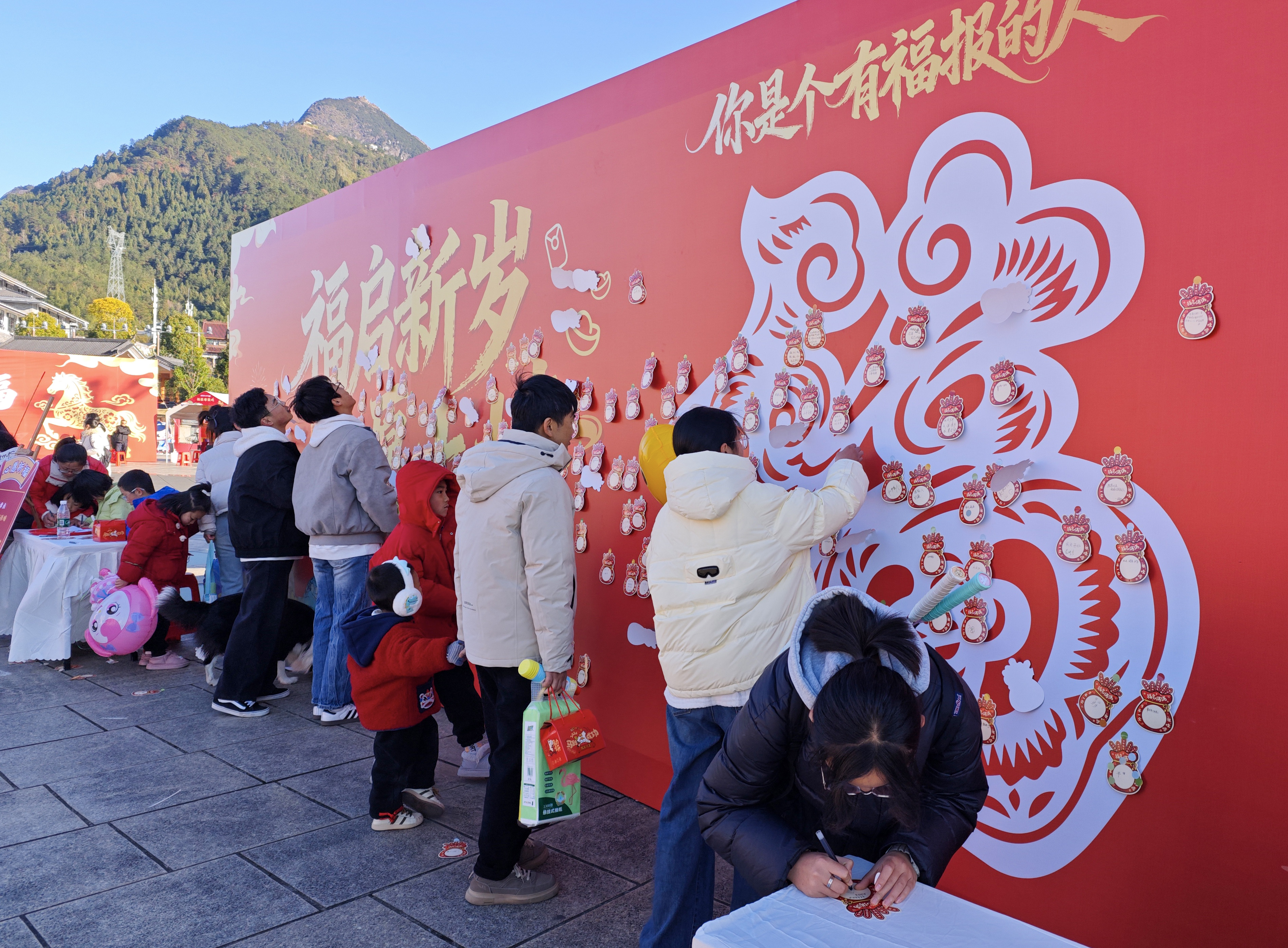 公園入口設置祈福墻,供游客書寫新年愿望并懸掛祈福牌。廣場上的非遺市集區、非遺手作體驗區、特色美食區、民俗趣味互動區等區域,通過集五福兌換禮品等形式,引導游客游覽核心區域,深度體驗柘榮文化。