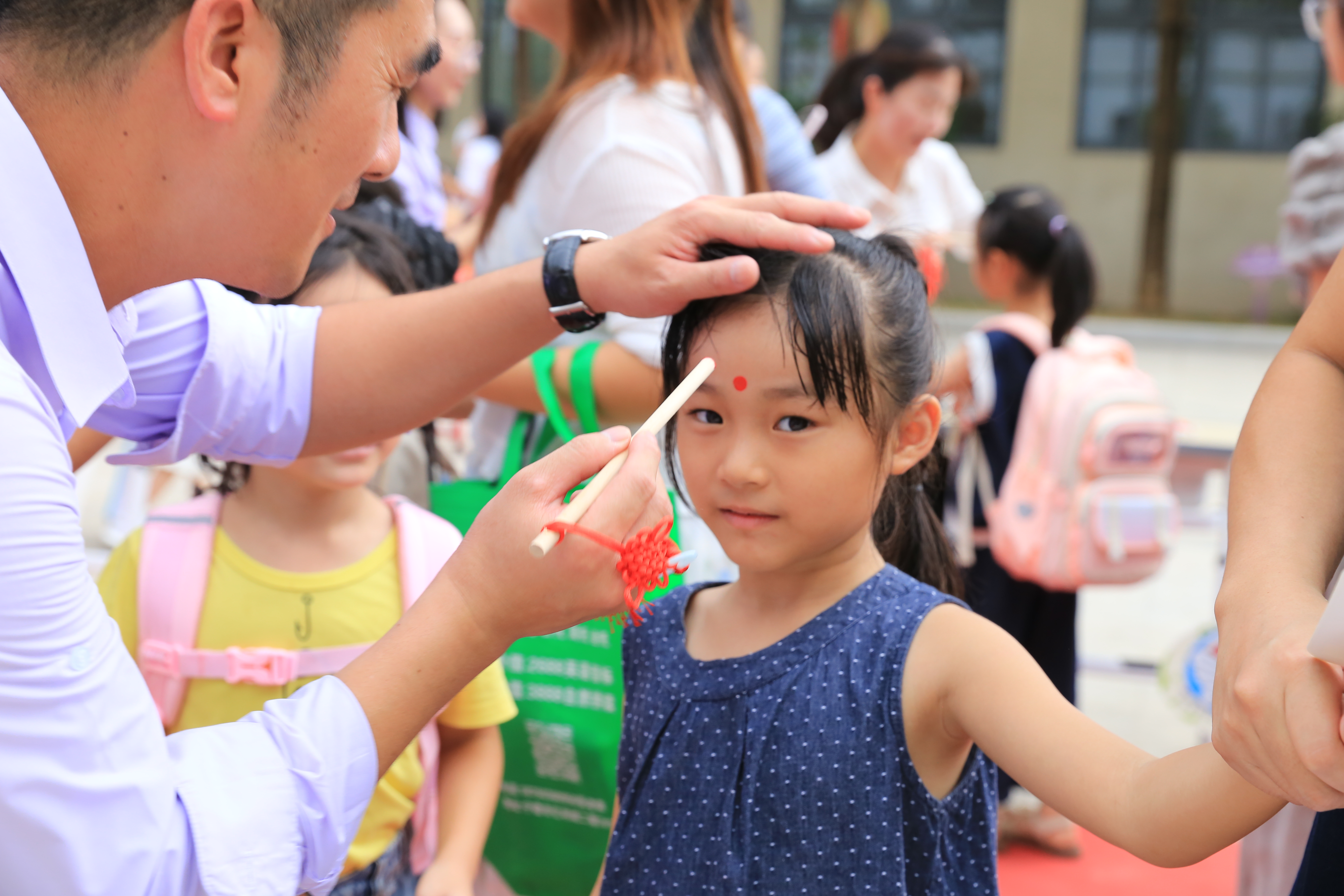 “來,小同學別緊張,低下頭。”隨著溫柔的提醒,一點鮮紅的朱砂穩穩地印在孩子們的眉心。這一點朱砂,不僅有傳統“開蒙啟智”的美好寓意,更是學校對孩子們的期許,愿孩子們從此眼明心亮,在知識的海洋里勇敢探索,開啟充滿智慧的校園生活。
