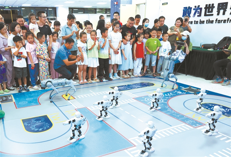市民與少年兒童一起觀看機器人、機器狗表演