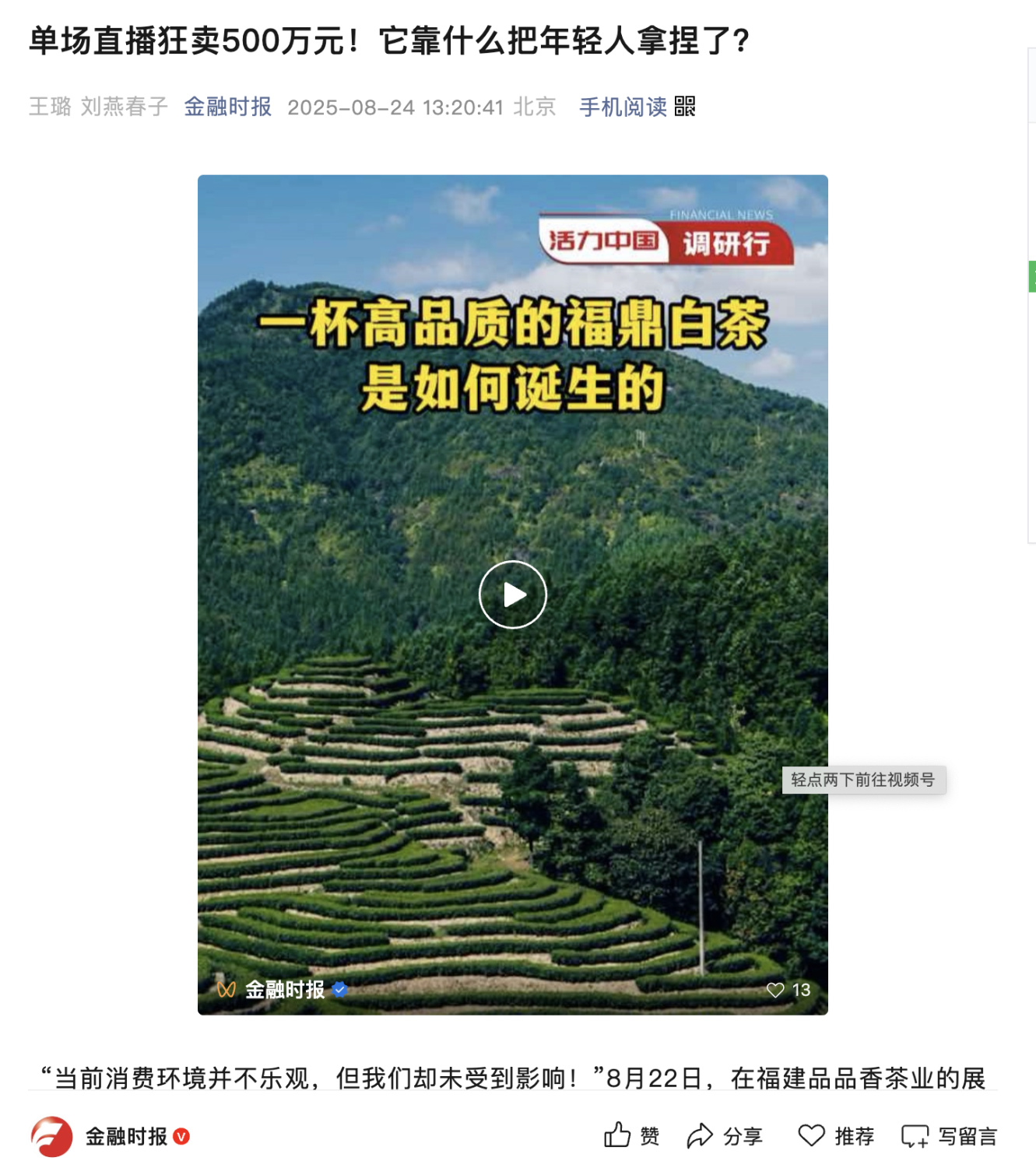 8月23日,金融時報視頻號發布報道《一杯高品質福鼎白茶是如何誕生的#福鼎白菜#福鼎》。