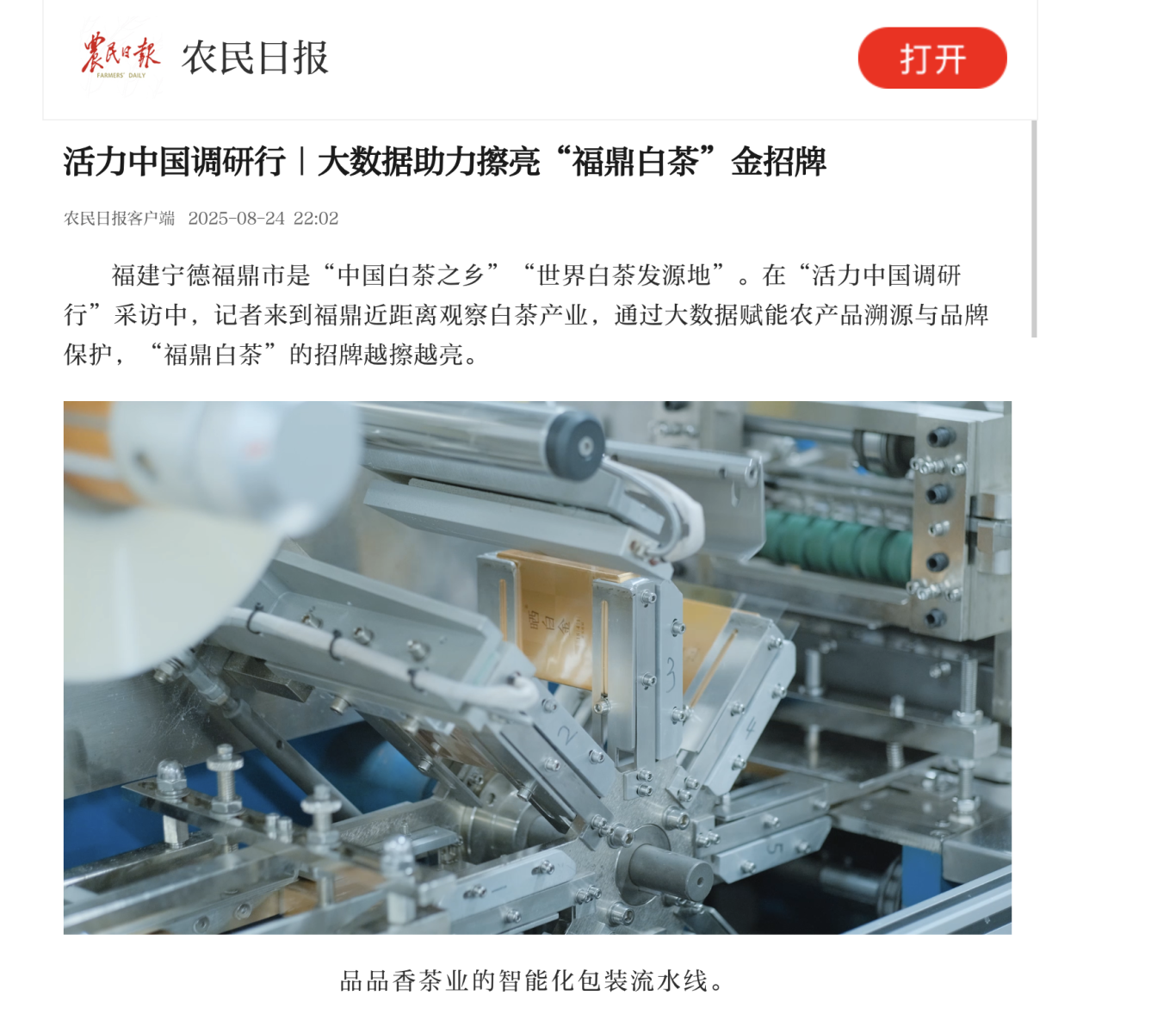 8月24日,農民日報客戶端發布報道《活力中國調研行|大數據助力擦亮“福鼎白茶”金招牌》。全國目前有福鼎白茶銷售網點1萬多個,38萬涉茶從業人員因茶致富、因茶興業。