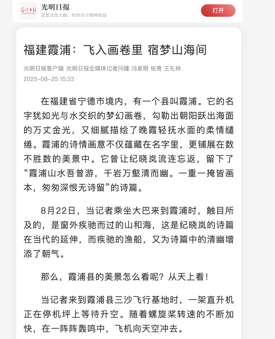 8月25日,光明日報客戶端發布報道《福建霞浦:飛入畫卷里 宿夢山海間》。與記者一起親身體驗霞浦低空經濟的吸引力,聊一聊東壁村民宿的故事。