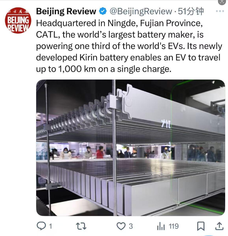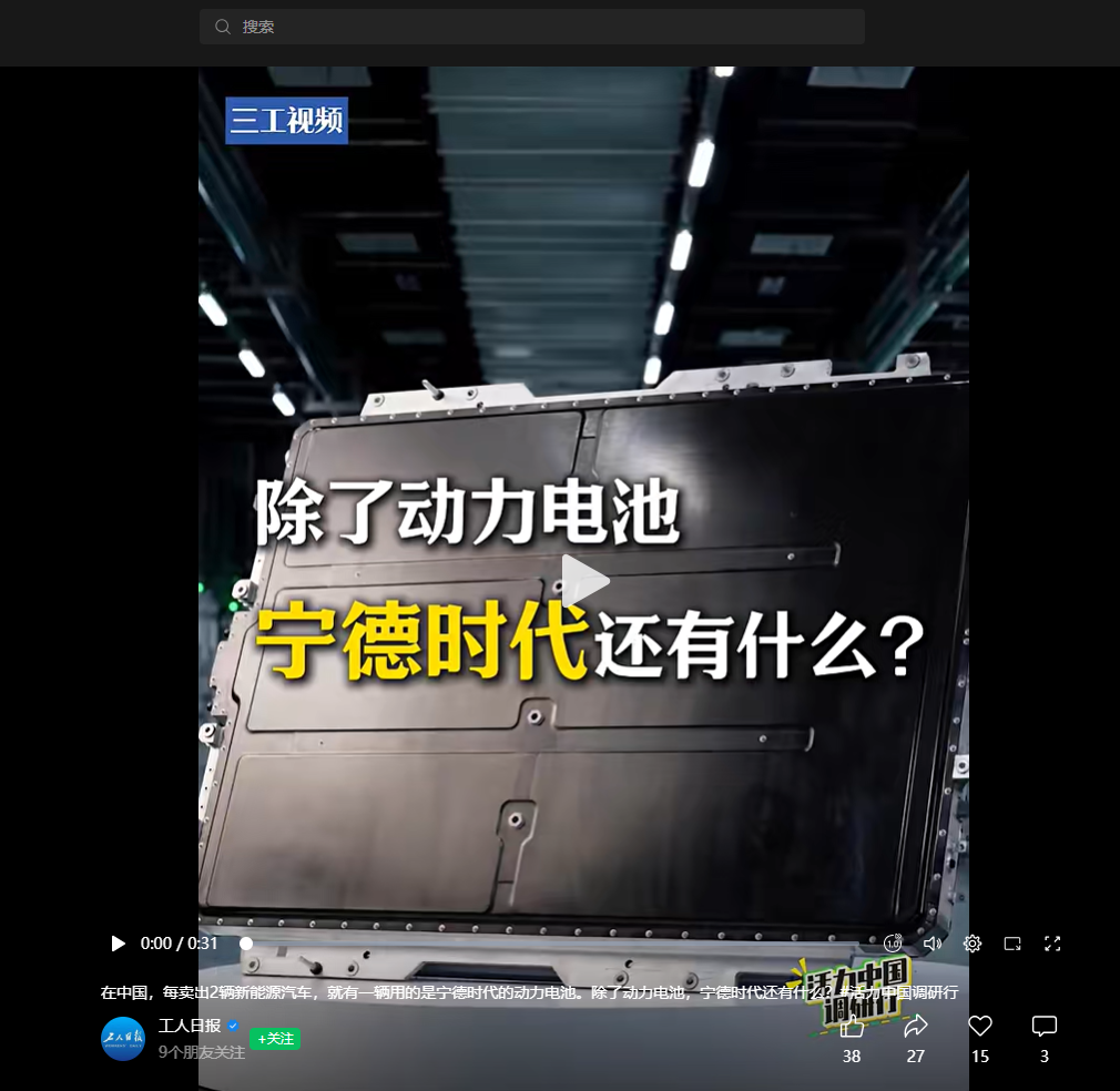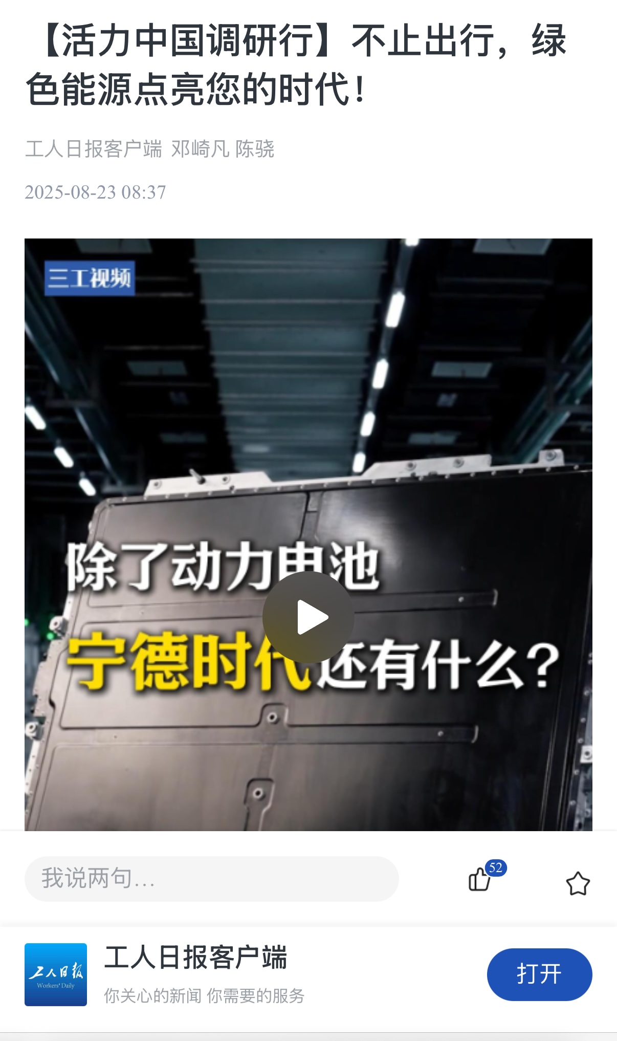 8月23日,工人日報視頻號發布報道《在中國,每賣出2輛新能源汽車,就有一輛用的是寧德時代的動力電池。除了動力電池,寧德時代還有什么?#活力中國調研行》。