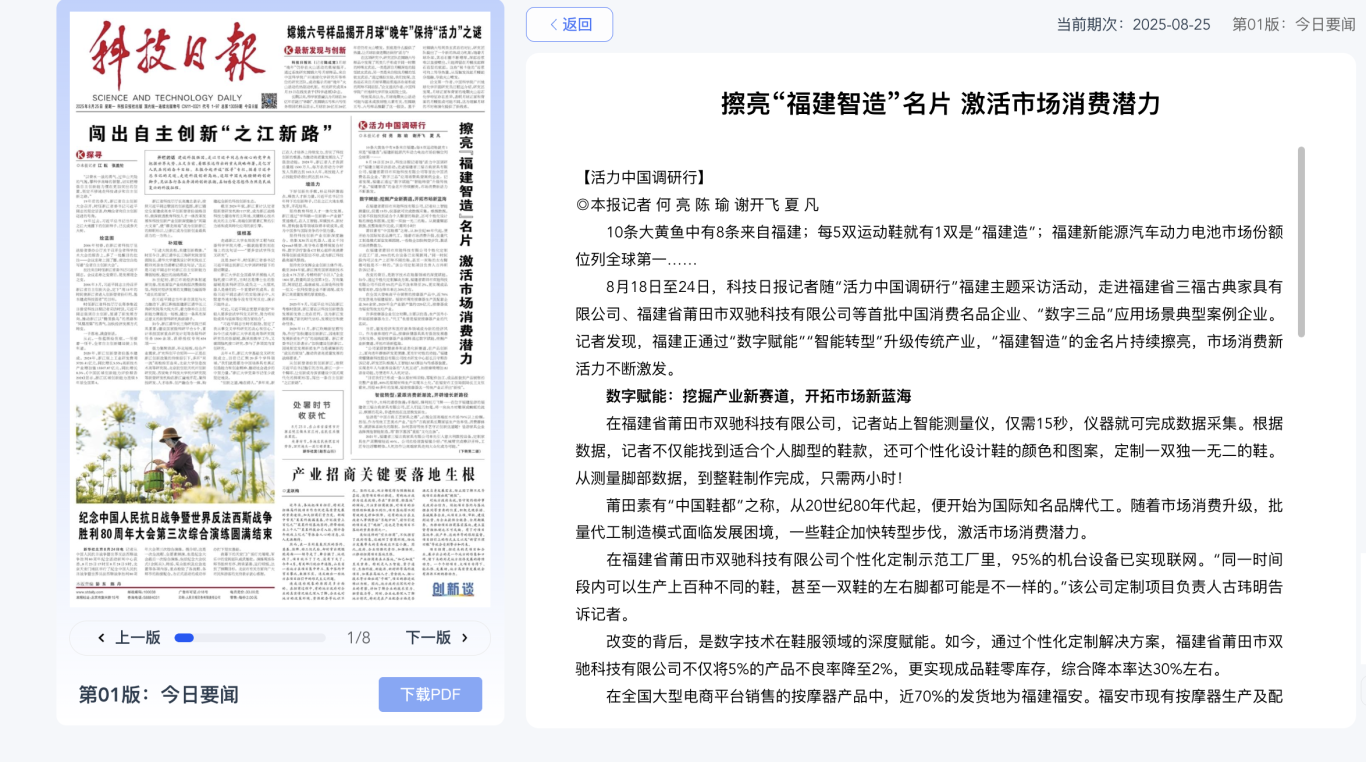 8月24日,《科技日報》頭版發布刊登報道《擦亮“福建智造”名片 激活市場消費潛力》。通過運用自動化設備,打通產業鏈、創新鏈,福鼎白茶這一傳統種植業走出了一條智能化、標準化、品牌化升級之路。