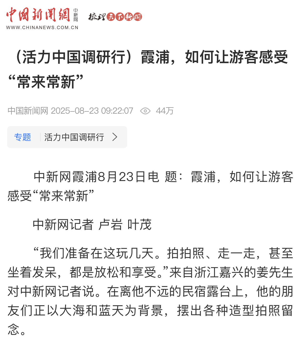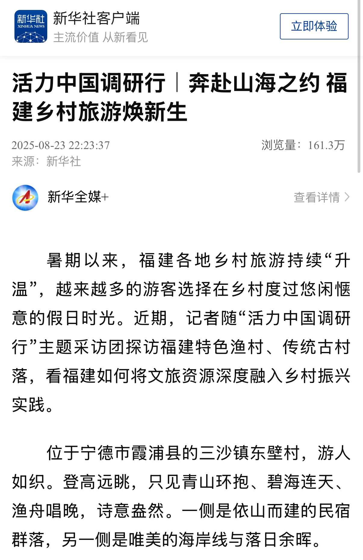 8月26日,新華網客戶端發布報道《活力中國調研行丨從“拍霞浦”到“住霞浦”,這片海正在長出新經濟》。6000多間客房、年接待游客超130萬人次、年營業額破4億元、帶動近2萬人就業——這組數據背后,是山海資源與鄉村振興的雙向奔赴。