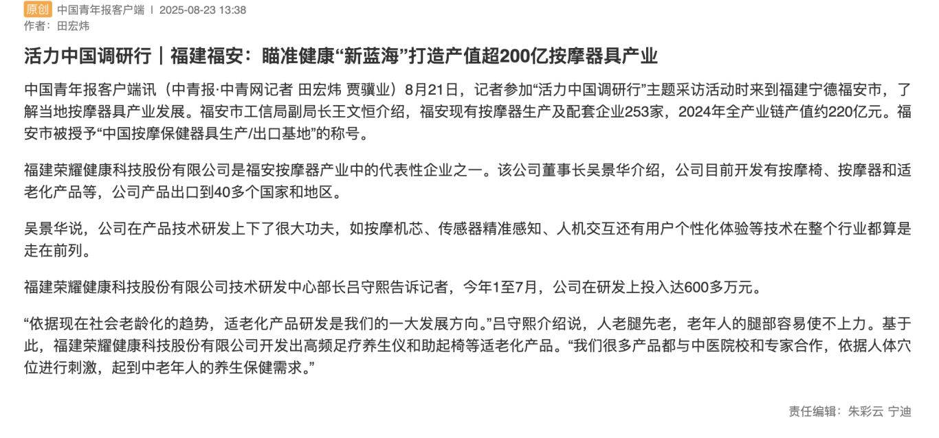 8月22日,科技日報客戶端發布報道《活力中國調研行丨一塊金牌“孵”出百億按摩器產業》。福安市擁有按摩器生產及配套企業360余家,其中規上企業38家,2024年全產業鏈產值約220億元,成為福安市傳統支柱產業。全國大型電商平臺銷售的按摩器具產品中,近70%的發貨地為福安。