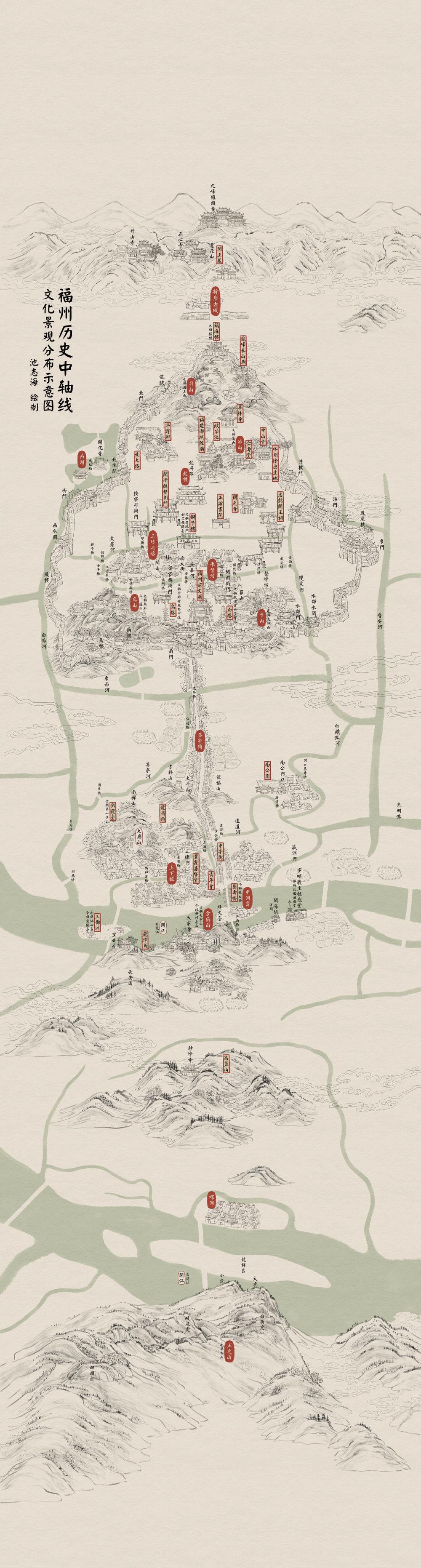 福州城市中軸線景觀分布圖。池志海制
