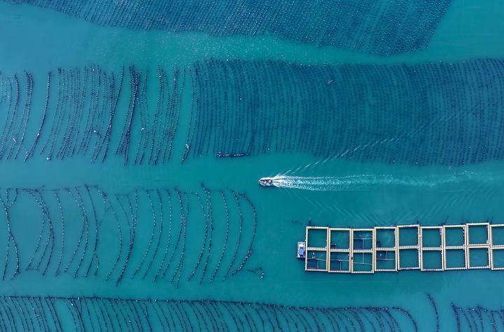 一艘海上作業漁船在連江縣黃岐半島海域海洋牧場中穿行(7月3日攝)。 新華社記者 魏培全 攝