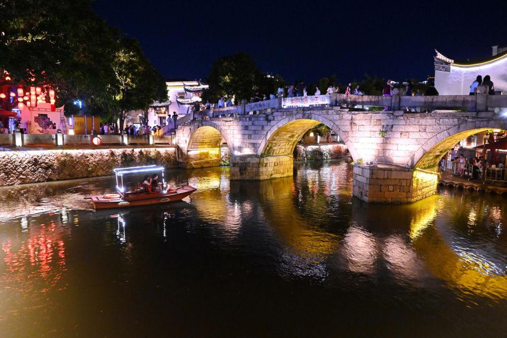 8月10日,市民游客在福州上下杭歷史文化街區的三捷河的三通橋上休憩游玩。