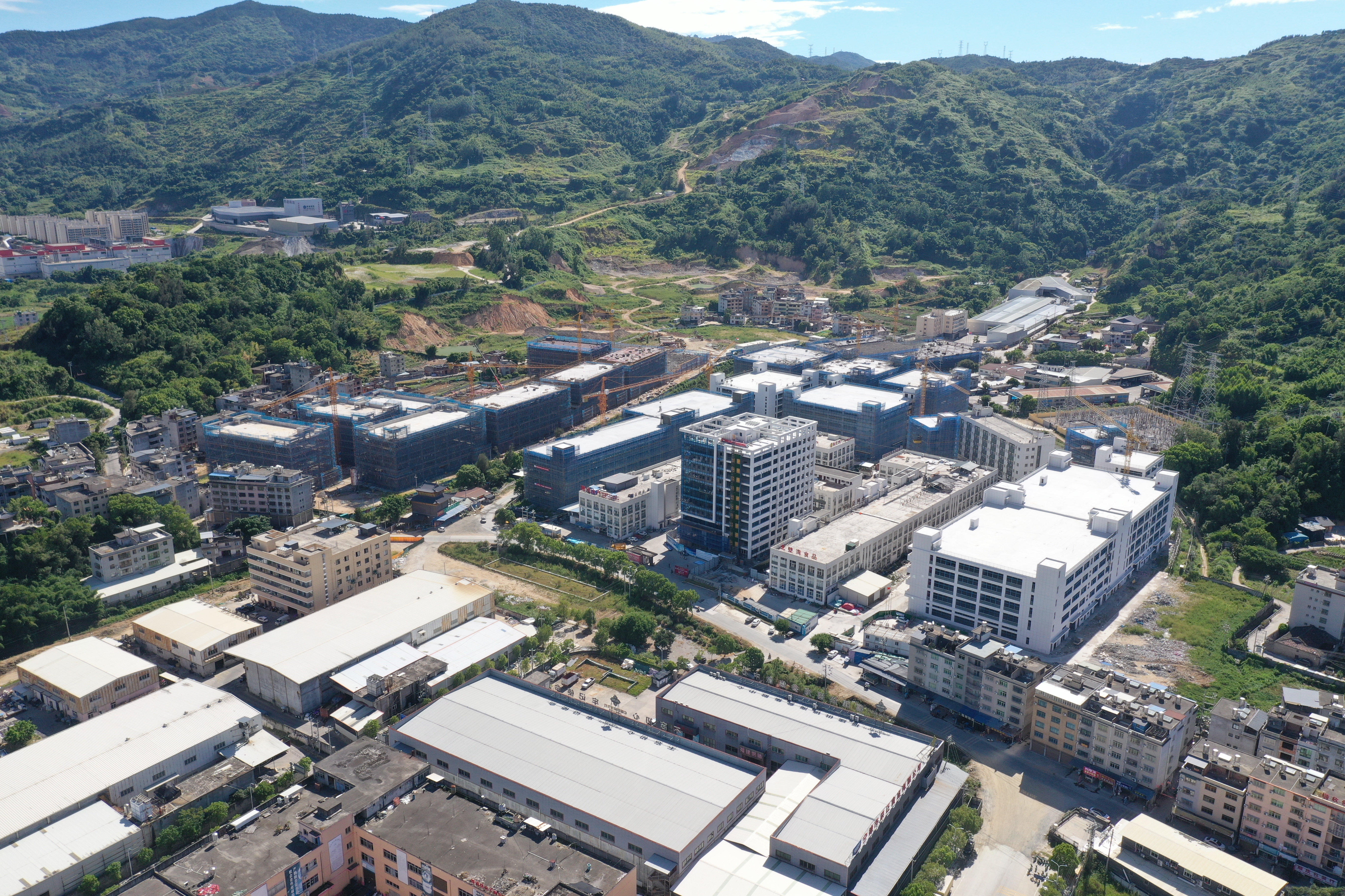 在施工現場,塔吊林立、機械轟鳴,200多名工人正緊張有序地分布在各個作業面,開展鋼筋綁扎、外墻抹灰等施工作業。目前,園區內各主體結構相繼封頂,外立面裝修同步推進,園區雛形初顯。