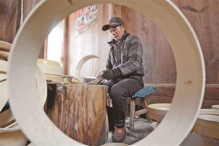 今年40多歲的黃之智是黃家蒸籠合作社聘請的師傅,他正在進行盤制蒸籠上下墩的工序。“這門手藝是哥哥教我的,目前在合作社一年可以收入3萬多元,我感到很滿足。”說話間,他拿起一個臉盆,盆口朝下,將已經上好膠的腰箍用力按壓定型。
