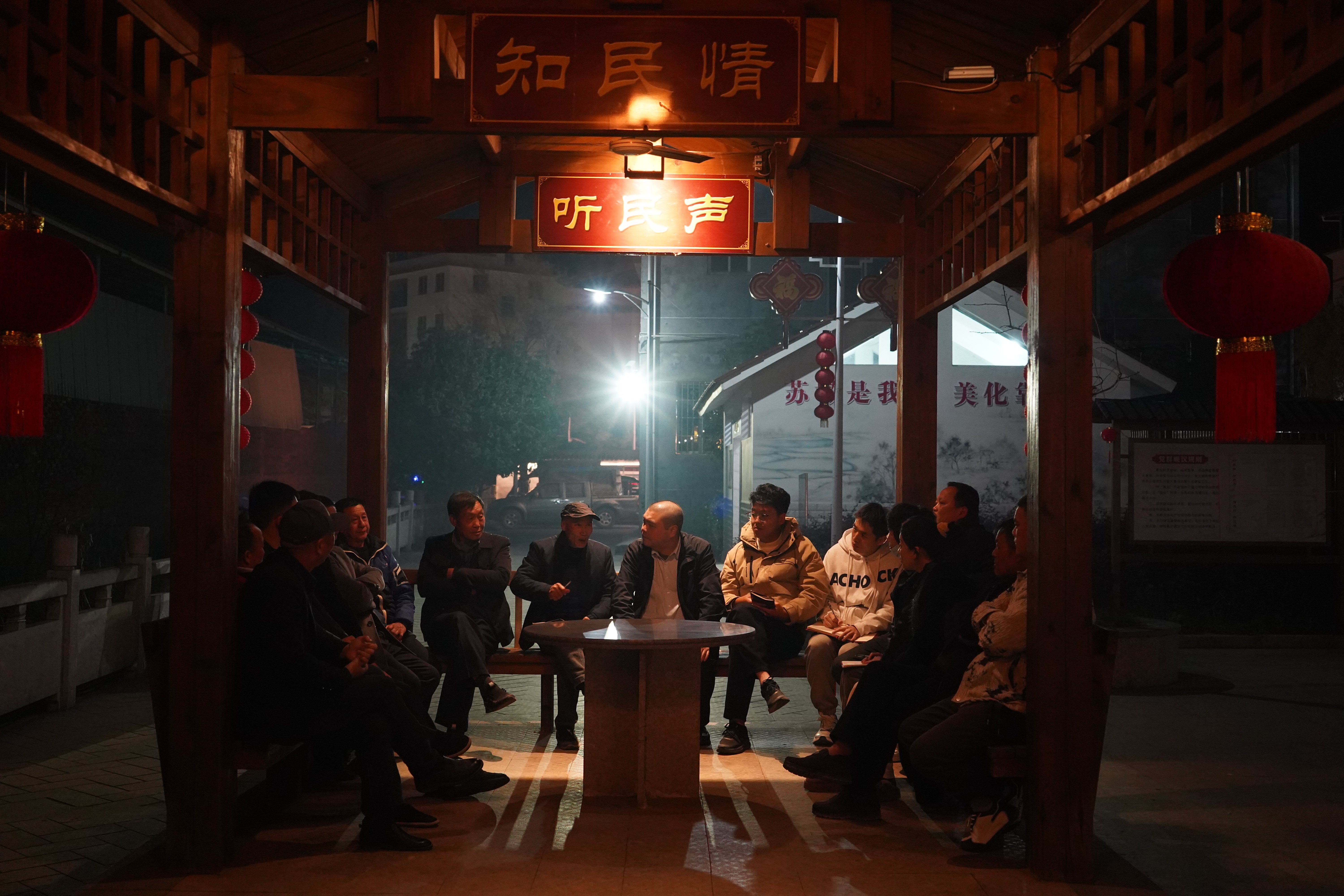 鳳埔鄉(xiāng)蘇墩鳳沖小廣場(chǎng)的亭子里,議事團(tuán)正和村民進(jìn)行晚議 林小穎攝