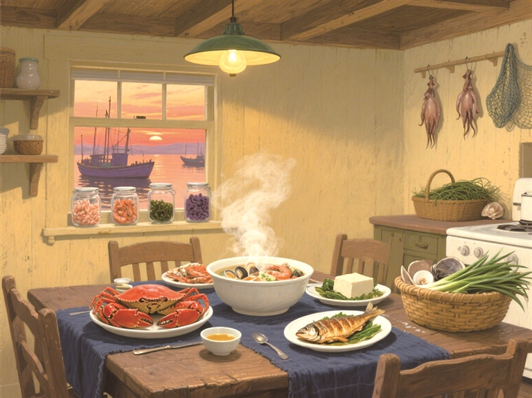海鮮街的鋪面次第排開,各家灶臺上升起的白煙在空中交織成網。青蟹在竹簍里揮舞螯足,碰撞出清脆的咔嗒聲;九節蝦通體透明,能看見淡青色的腸線貫穿首尾……食客們圍坐在油膩的木桌旁,就著海風啜飲土釀米酒,蟹殼在齒間碎裂的聲響,似乎要與遠處漁船的汽笛奏一曲交響……