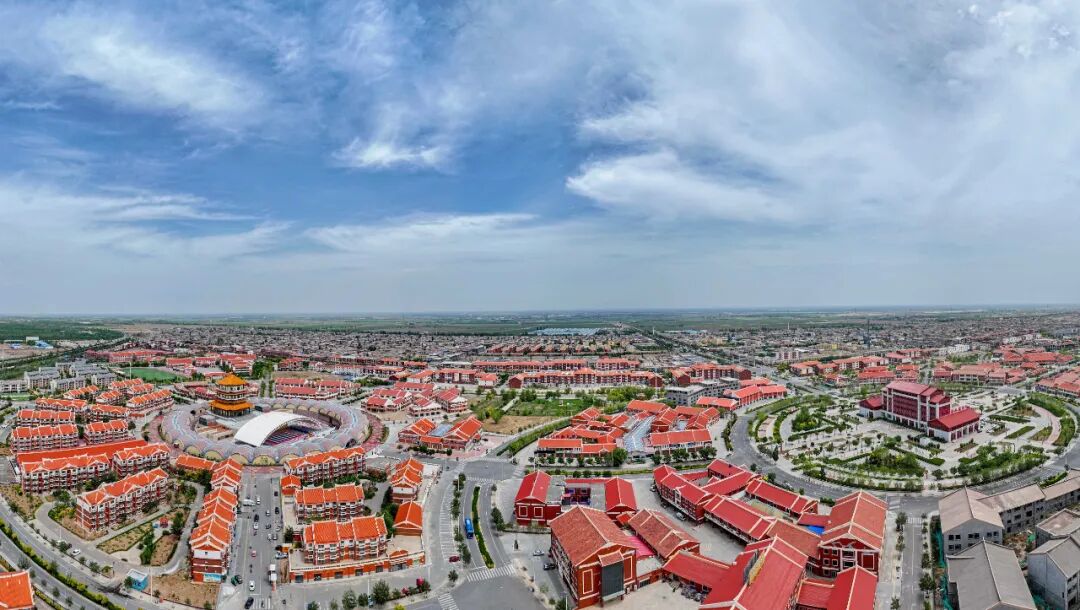 登高遠眺,整個小鎮(zhèn)盡收眼底:一幢幢紅色建筑如花瓣般環(huán)繞中心層層展開——紅墻、紅瓦、翹起的燕尾脊,形似閩南紅磚古厝,散發(fā)著濃郁的閩風閩韻;遠處,雄偉的賀蘭山脈默默矗立,與眼前的閩派建筑相映成畫,恰似“山海”攜手的具象寫照。