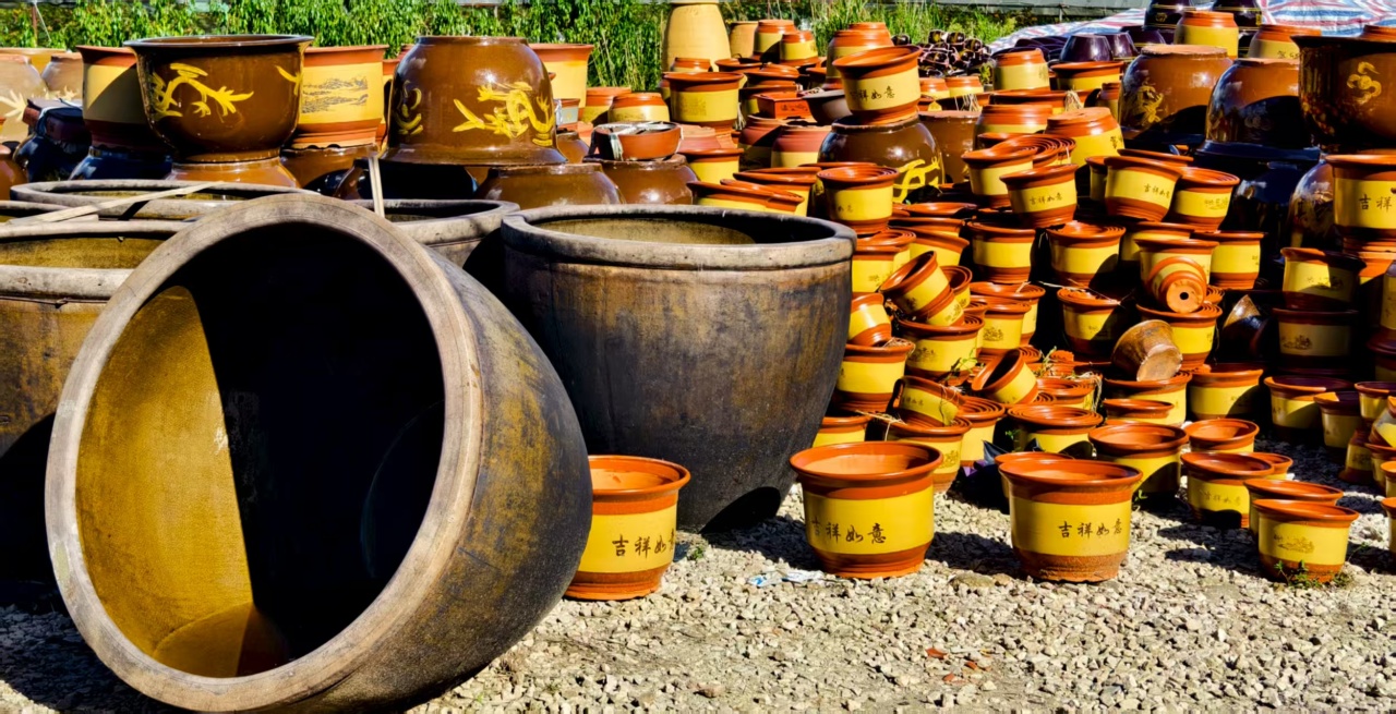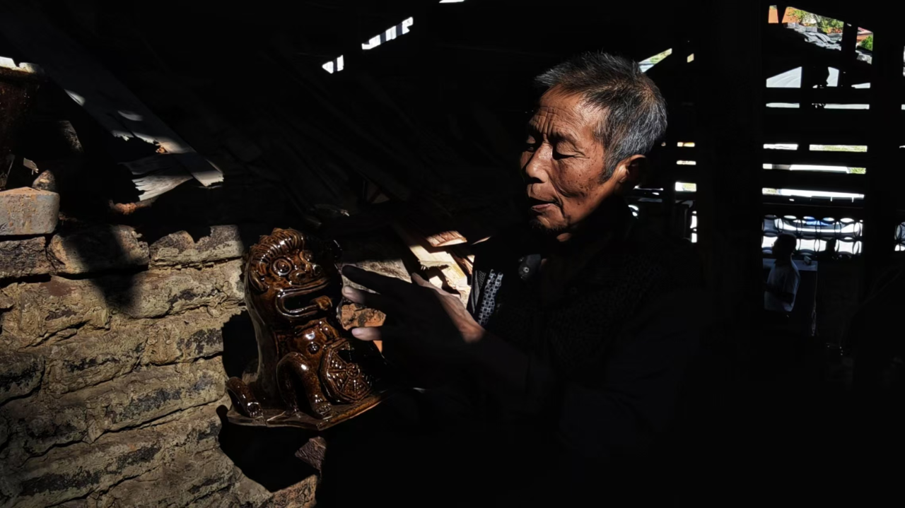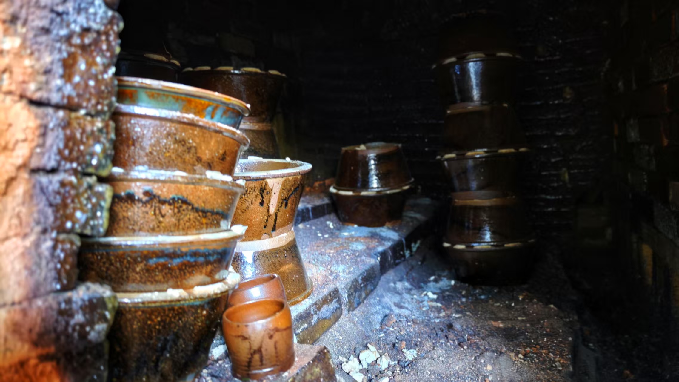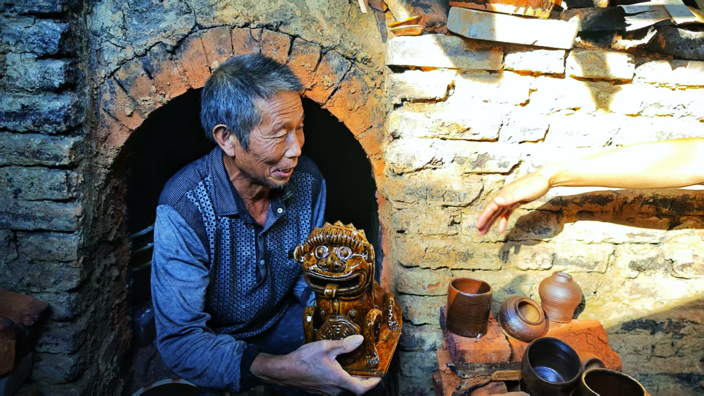 午后的陽(yáng)光斜照進(jìn)萌源村月山古龍窯的窯口,陶土的芬芳混合著柴火的氣息在空氣中彌漫。萌源制硋世家第八代傳人肖永燦正翻看著新燒制的硋器。