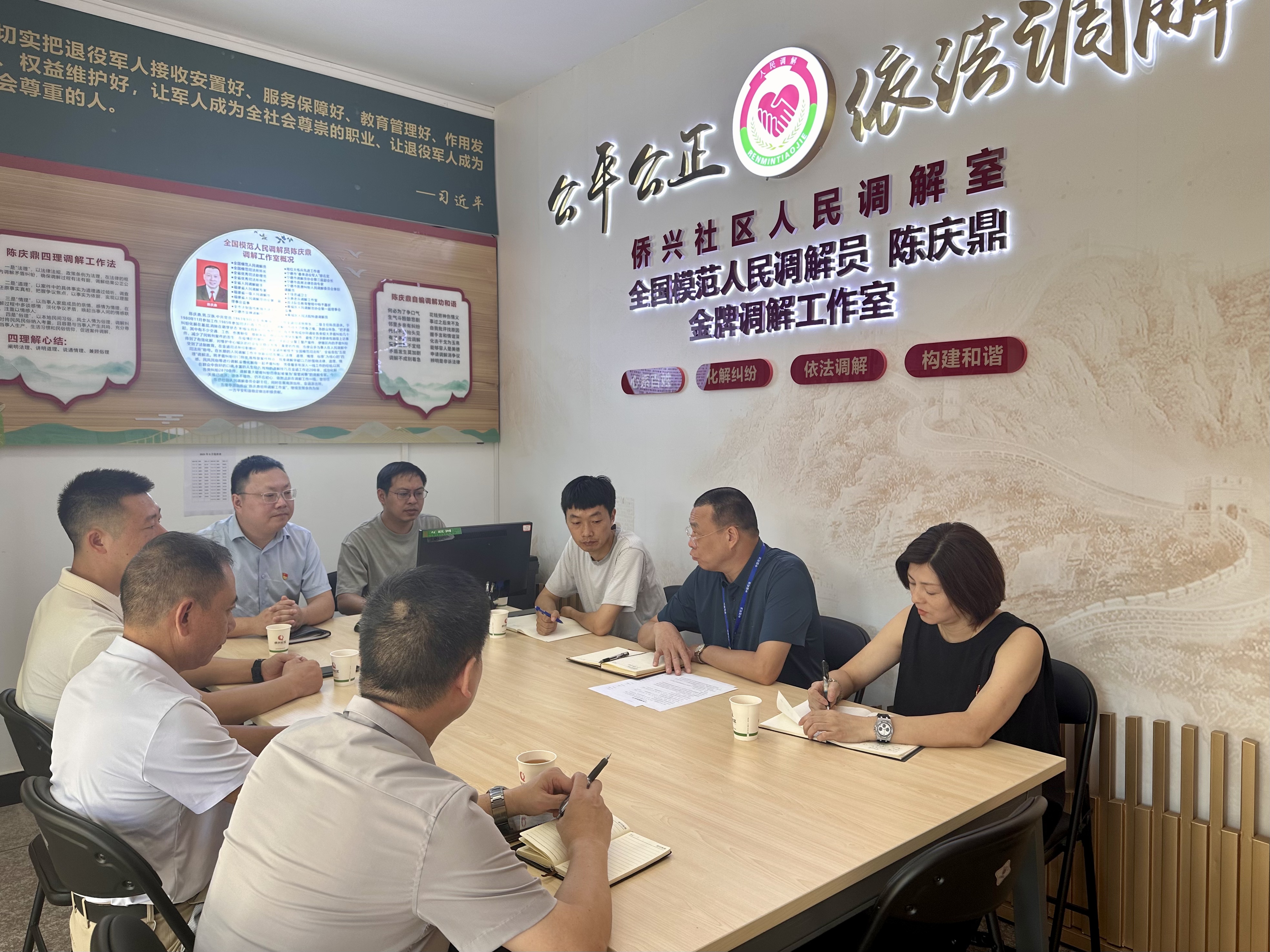 為有效化解矛盾、維護(hù)社區(qū)和諧穩(wěn)定,2024年12月,在東僑經(jīng)濟(jì)技術(shù)開發(fā)區(qū)人民調(diào)解委員會的支持下,僑興社區(qū)居委會依托全國模范人民調(diào)解員陳慶鼎金牌調(diào)解工作室,成立“僑興社區(qū)人民調(diào)解室”。并逐步構(gòu)建起以“同心圓”平安矩陣為核心的“1+8+N”多元解紛體系。該體系以社區(qū)黨總支為圓心,7個小區(qū)調(diào)解小組和1支志愿調(diào)解員隊(duì)伍為中堅(jiān),廣泛融入法院、檢察院、公安局、信訪局及律師、心理咨詢師等社會資源,形成多元共治格局。