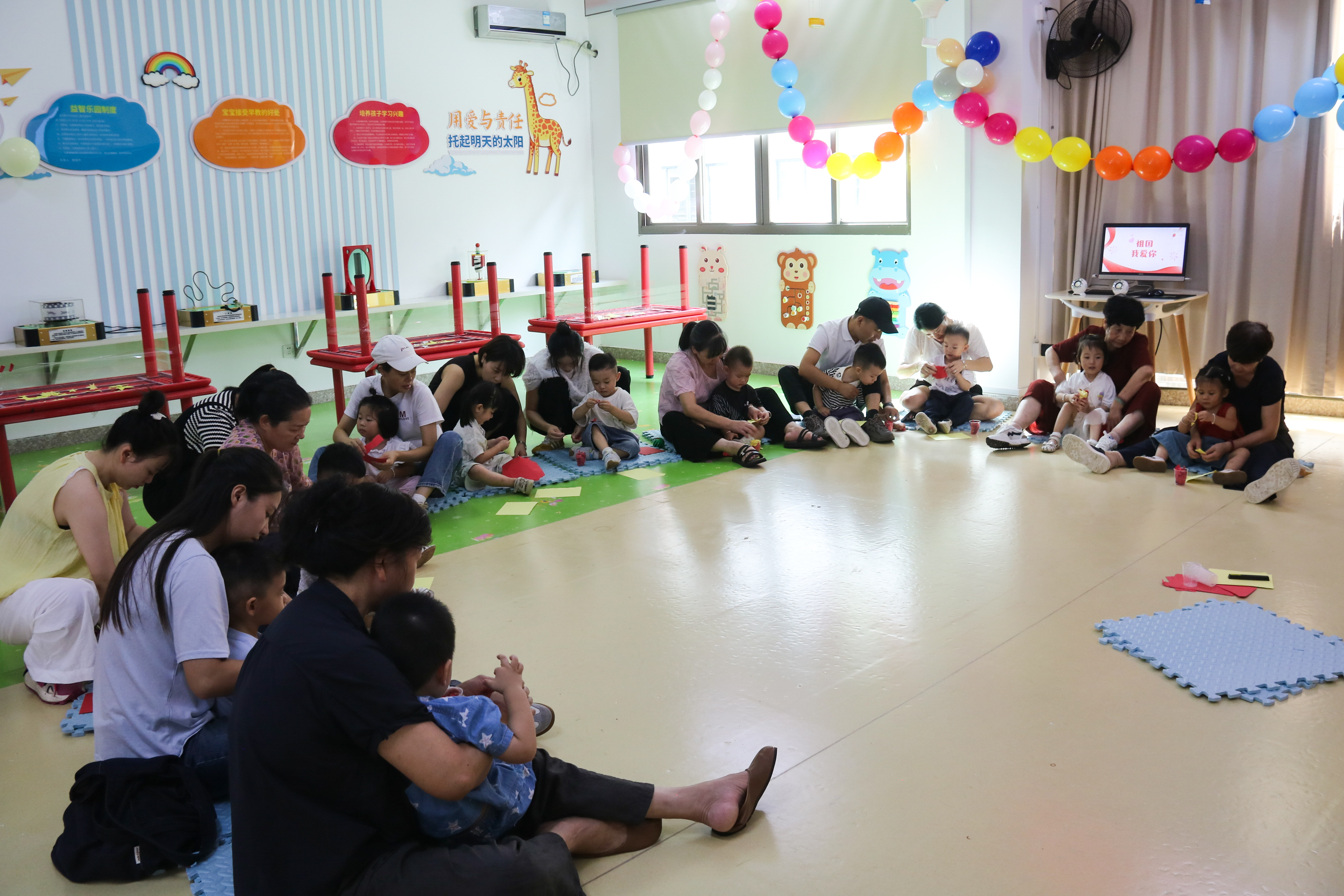 走進(jìn)“向日葵親子小屋”,現(xiàn)場(chǎng)布置的溫馨又充滿節(jié)日氛圍,彩色氣球點(diǎn)綴其間,搭配著墻面上朵朵手繪向日葵貼紙,顯得格外活潑。孩子們與家長(zhǎng)則圍坐成半圓形,滿是雀躍與期待。