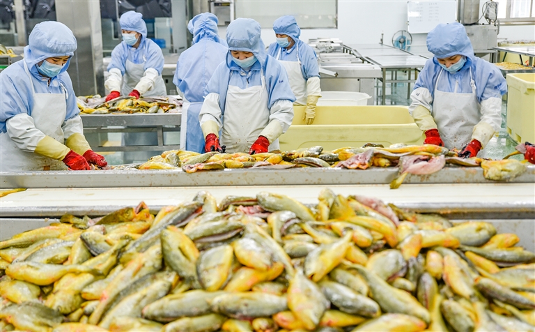 企業員工在加工剛捕撈的大黃魚 張文奎 攝