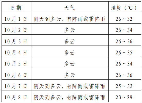 10月1日陰天到多云,有分散性陣雨或雷陣雨;2~6日以多云天氣為主;7~8日陰天到多云,部分有陣雨或雷陣雨。