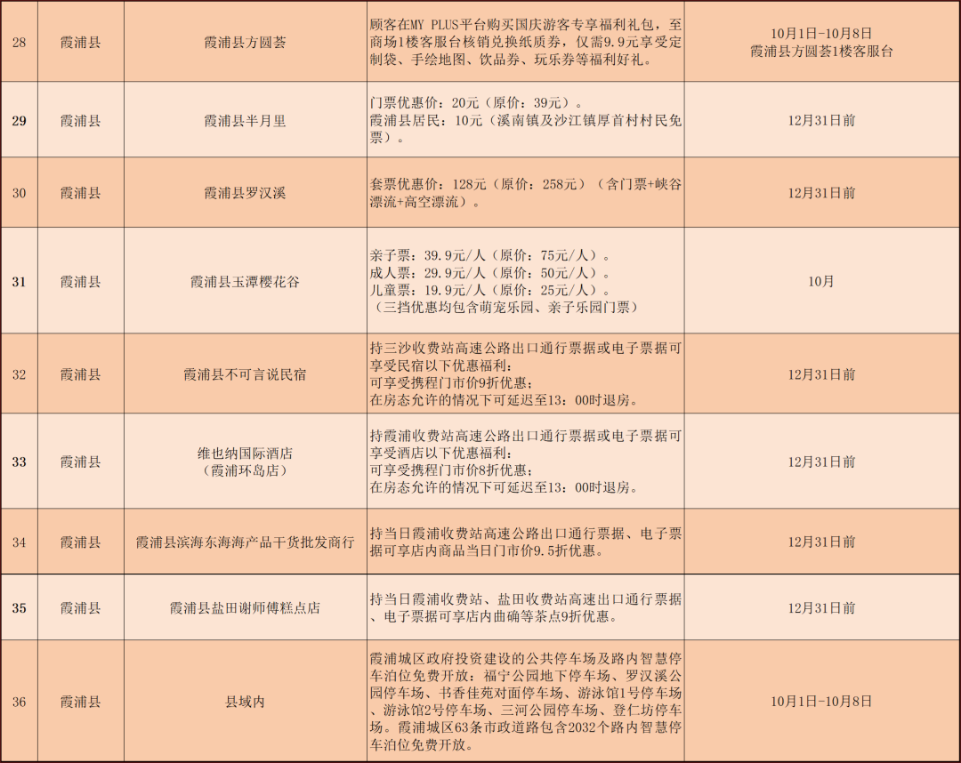 國慶期間,霞浦縣部分酒店、民宿、特產(chǎn)店將推出高速公路通行費抵扣優(yōu)惠活動。1.霞浦縣不可言說民宿。持三沙收費站高速公路出口通行票據(jù)或電子票據(jù)可享受攜程門市價9折優(yōu)惠;在房態(tài)允許的情況下可延遲至13:00時退房。2.維也納國際酒店(霞浦環(huán)島店)。持霞浦收費站高速公路出口通行票據(jù)或電子票據(jù)可享受攜程門市價8折優(yōu)惠;在房態(tài)允許的情況下可延遲至13:00時退房。3.霞浦縣濱海東海海產(chǎn)品干貨批發(fā)商行。持當(dāng)日霞浦收費站高速公路出口通行票據(jù)、電子票據(jù)可享店內(nèi)商品當(dāng)日門市價9.5折優(yōu)惠。4.霞浦縣鹽田謝師傅糕點店。持當(dāng)日霞浦收費站、鹽田收費站高速出口通行票據(jù)、電子票據(jù)可享店內(nèi)曲奇等茶點9折優(yōu)惠。