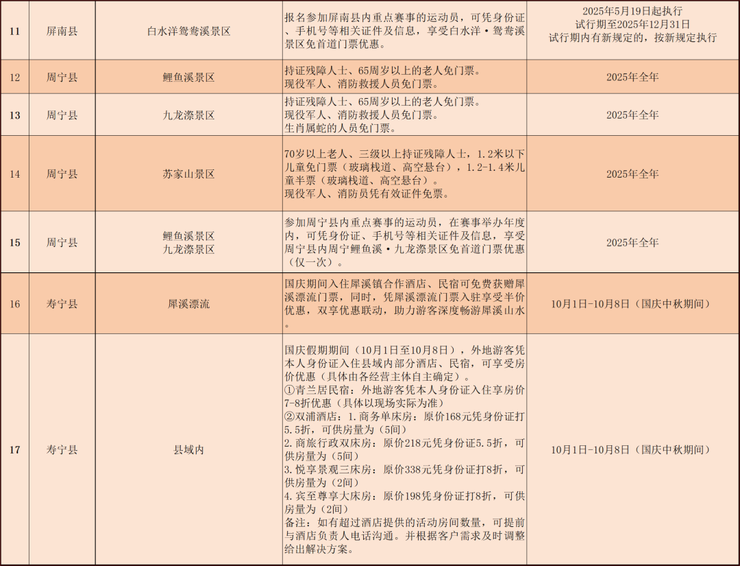 2.國慶期間,外地游客憑本人身份證入住壽寧縣域內(nèi)部分酒店、民宿,可享受房價優(yōu)惠(具體由各經(jīng)營主體自主確定)。1.青蘭居民宿:外地游客憑本人身份證入住享房價7-8折優(yōu)惠(具體以現(xiàn)場實際為準(zhǔn))2.雙浦酒店:①商務(wù)單床房:原價168元憑身份證打5.5折,可供房量5間;②商旅行政雙床房:原價218元憑身份證5.5折,可供房量5間;③悅享景觀三床房:原價338元憑身份證打8折,可供房量2間;④賓至尊享大床房:原價198憑身份證打8折,可供房量2間。
