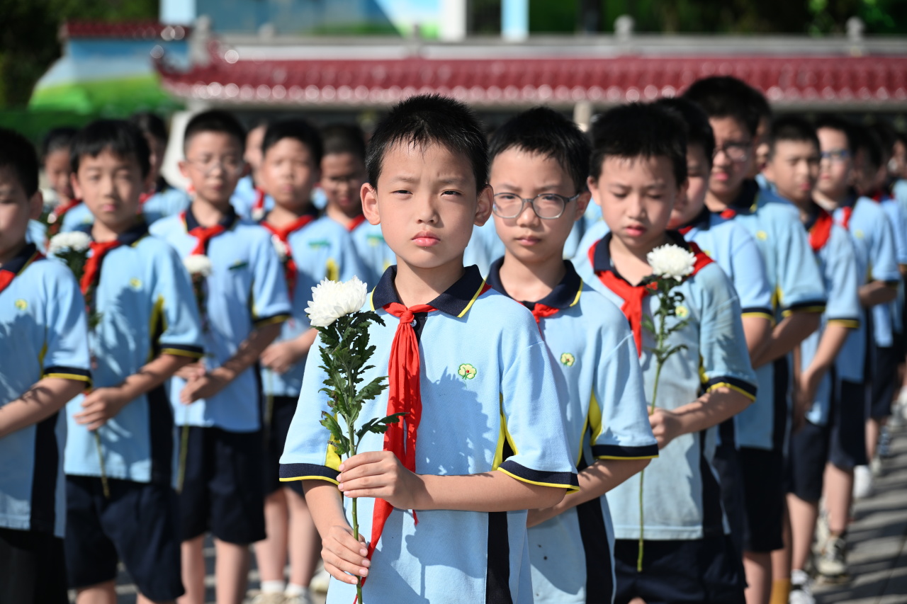 松柏蒼翠,陵園肅穆。9時,儀式開始。雄壯的《義勇軍進行曲》奏響,全場齊聲高唱中華人民共和國國歌。國歌唱畢,全體肅立,向革命烈士默哀。默哀畢,手持鮮花的少先隊員們齊聲獻唱《我們是共產主義接班人》。
