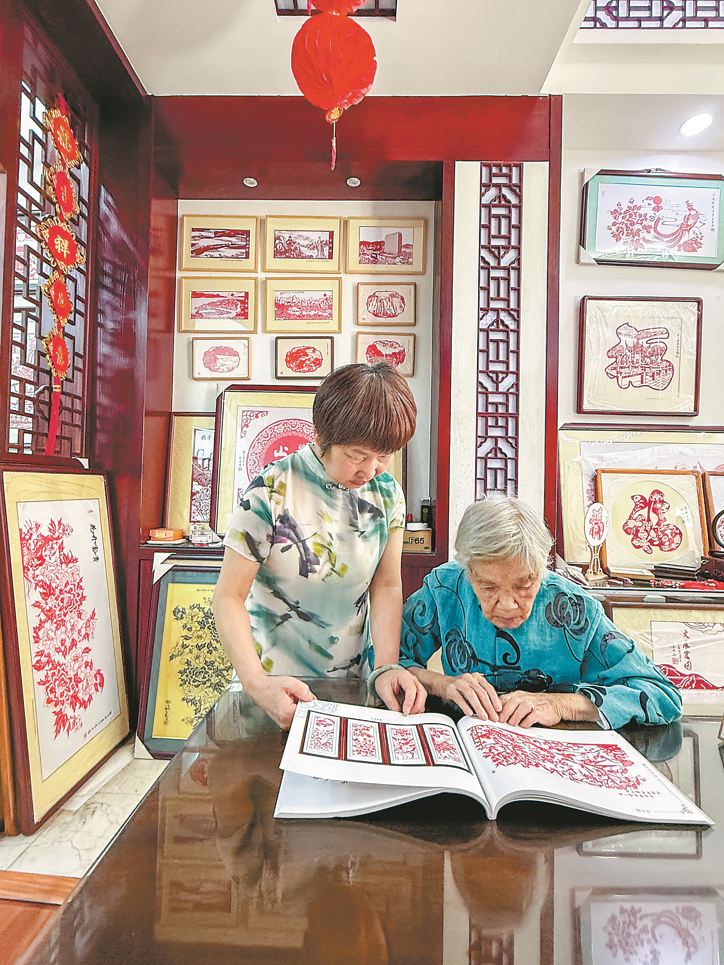 袁秀瑩(右)和吳秋鳳(左)探討剪紙技藝。
