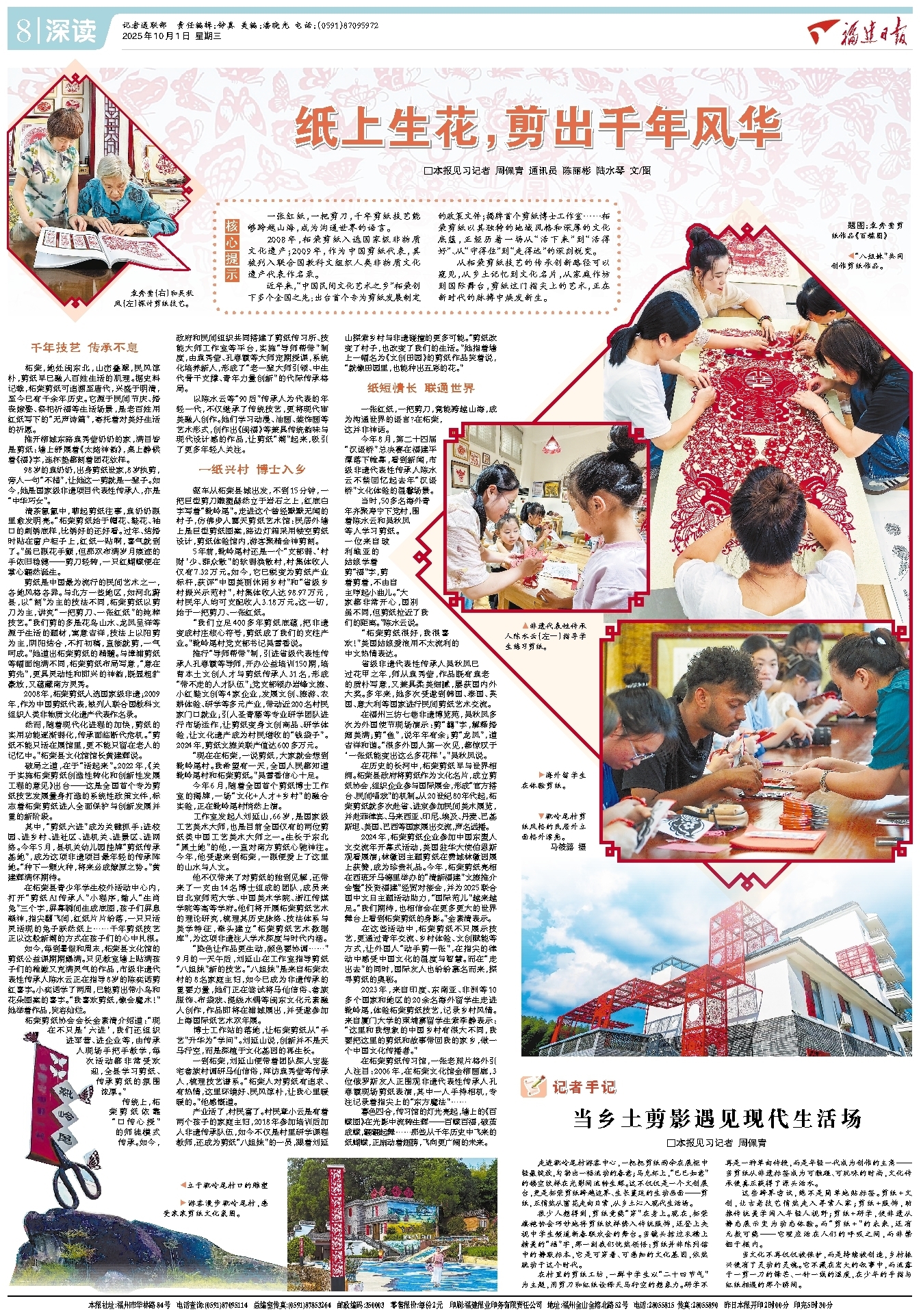 產業活了,村民富了。村民章小云是有著兩個孩子的家庭主婦,2018年參加培訓后加入非遺傳承隊伍,如今不僅是村里研學課程教師,還成為剪紙“八姐妹”的一員,跟著劉延山探索鄉村與非遺碰撞的更多可能。“剪紙改變了村子,也改變了我們的生活。”她指著墻上一幅名為《文創田園》的剪紙作品笑著說,“就像田園里,也能種出五彩的花。”