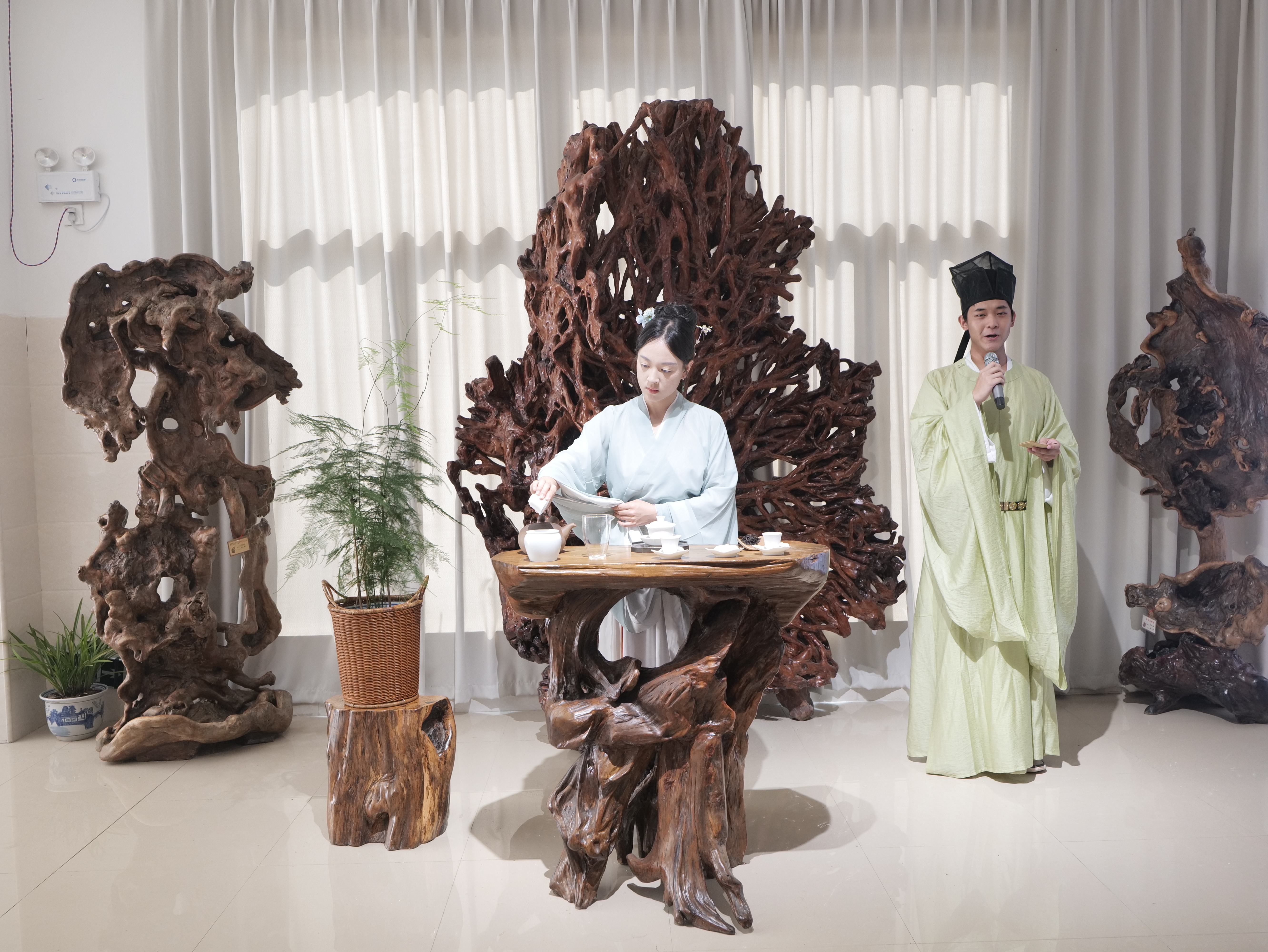 活動現場,擺放了以根雕為材質的茶桌、茶具,搭配不同品類的茶葉,打造出沉浸式的茶空間,工作人員詳細講解根雕茶器的工藝與文化內涵,茶藝師以根雕茶具演繹行云流水的茶藝,讓觀眾讀懂非遺里的 “慢與雅”。隨后,參與者移步至第二、三會館,相繼體驗根雕與音樂、舞蹈融合的藝術表達,感受不同藝術形式碰撞的魅力。