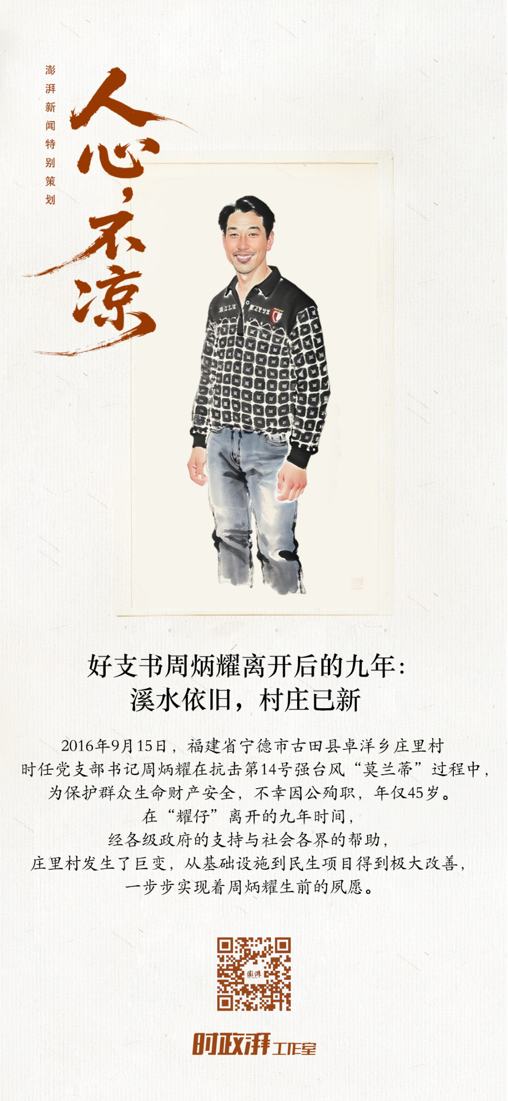 今天要講的是英雄周炳耀的故事。2016年9月15日,福建省寧德市古田縣卓洋鄉莊里村時任黨支部書記周炳耀在抗擊第14號強臺風“莫蘭蒂”過程中,為保護群眾生命財產安全,不幸因公殉職,年僅45歲。在“耀仔”離開的九年時間,經各級政府的支持與社會各界的幫助,莊里村發生了巨變,從基礎設施到民生項目都得到極大改善,村民收入也在逐年提高,一步步實現著平凡英雄周炳耀生前的夙愿。