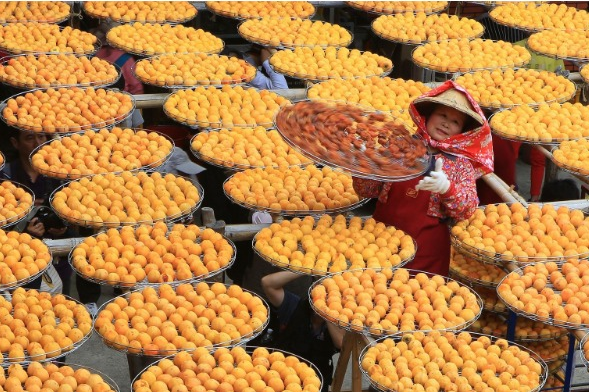 黃澄澄的柿子在柿子架上鋪陳開(kāi)來(lái)
