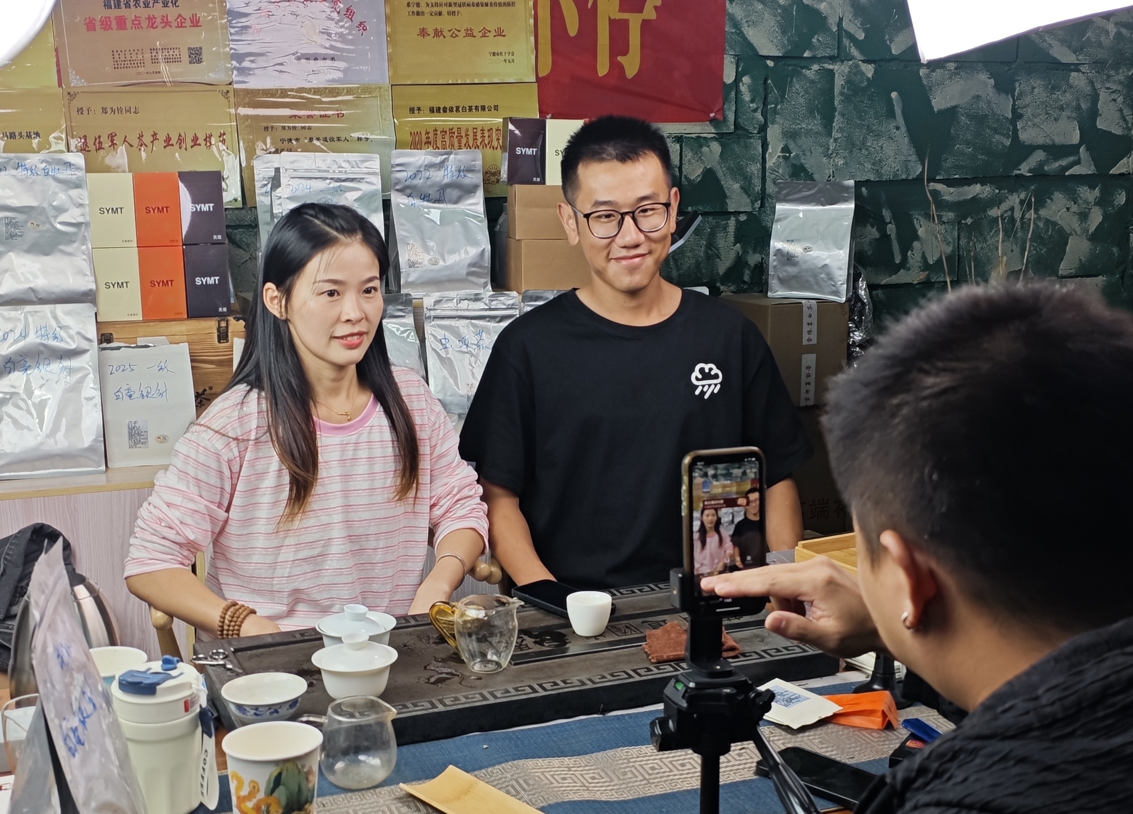 李圣鵬(右)正在直播間向網友推介瑞云白茶