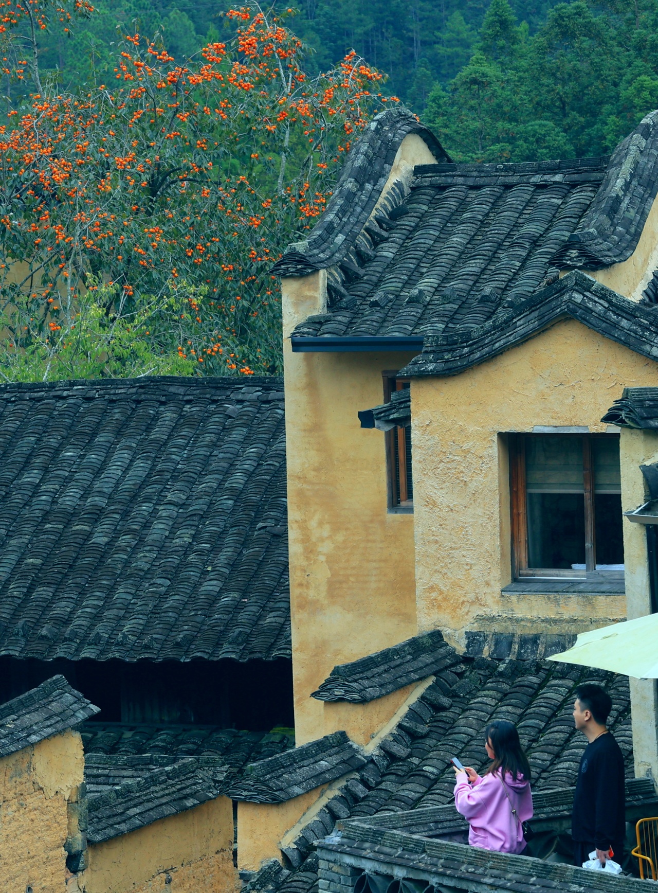 穿漢服的姑娘在柿樹下取景,創(chuàng)客們?cè)诳Х瑞^里碰撞靈感,游人們沿著雨廊賞景休憩,清脆的笑聲與枝頭鳥鳴交織,為古村注入鮮活生機(jī),也使來自福州的游客李先生感到欣喜:“第一次來四坪村,感覺像走進(jìn)了畫里。不僅風(fēng)景美,更有一種讓人慢下來的生活氣息,紅彤彤的柿子讓整個(gè)村子都充滿了喜慶和溫暖,我們拍了很多照片,準(zhǔn)備發(fā)個(gè)朋友圈好好推薦一下!”