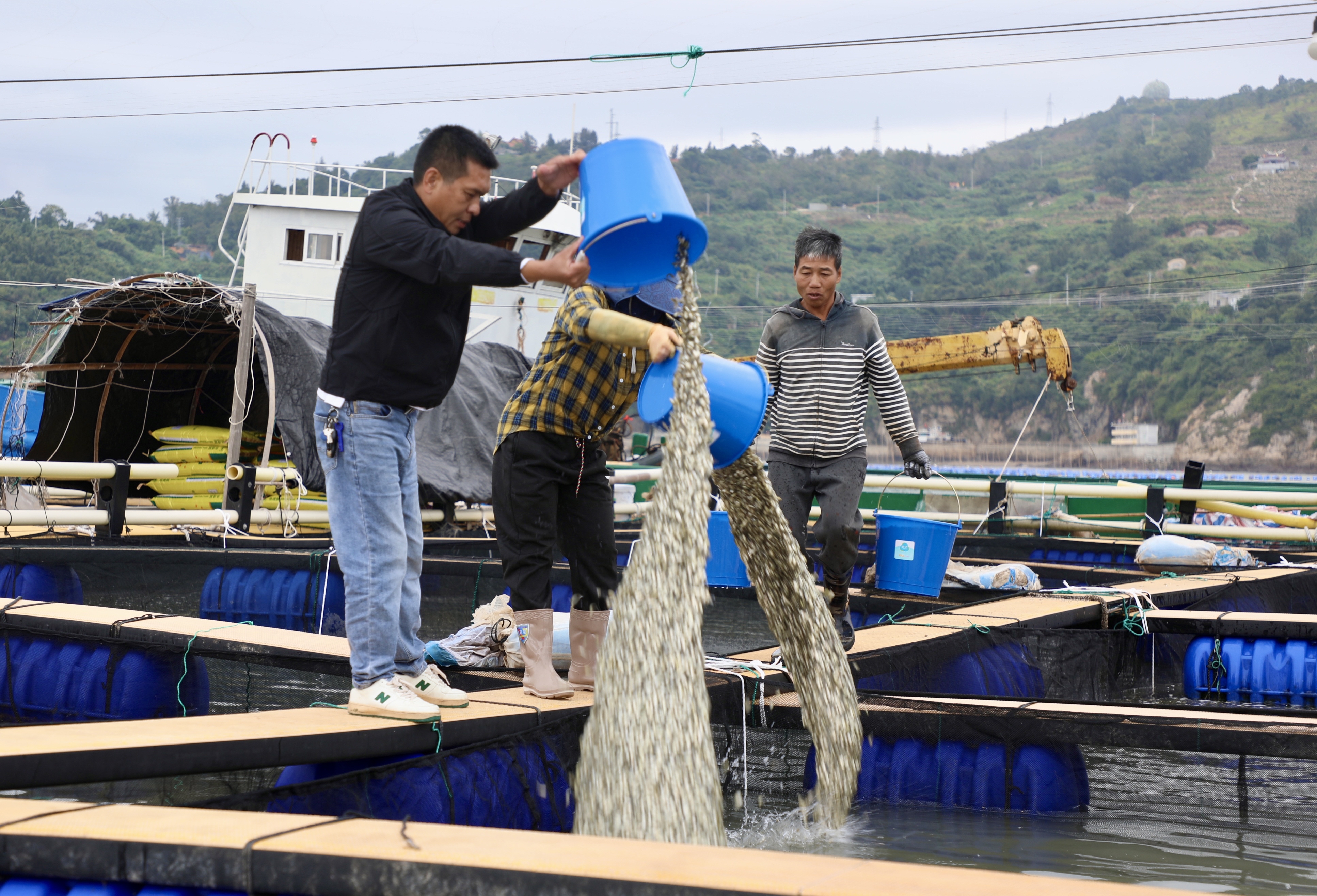 近日,在福鼎市沙埕鎮王谷村的漁潤水產養殖專業合作社,工人們正有序開展下網、起苗作業。一尾尾活力十足的大黃魚苗經大口徑塑料軟管被輸送至海岸邊的活水船,即將投入海上養殖。