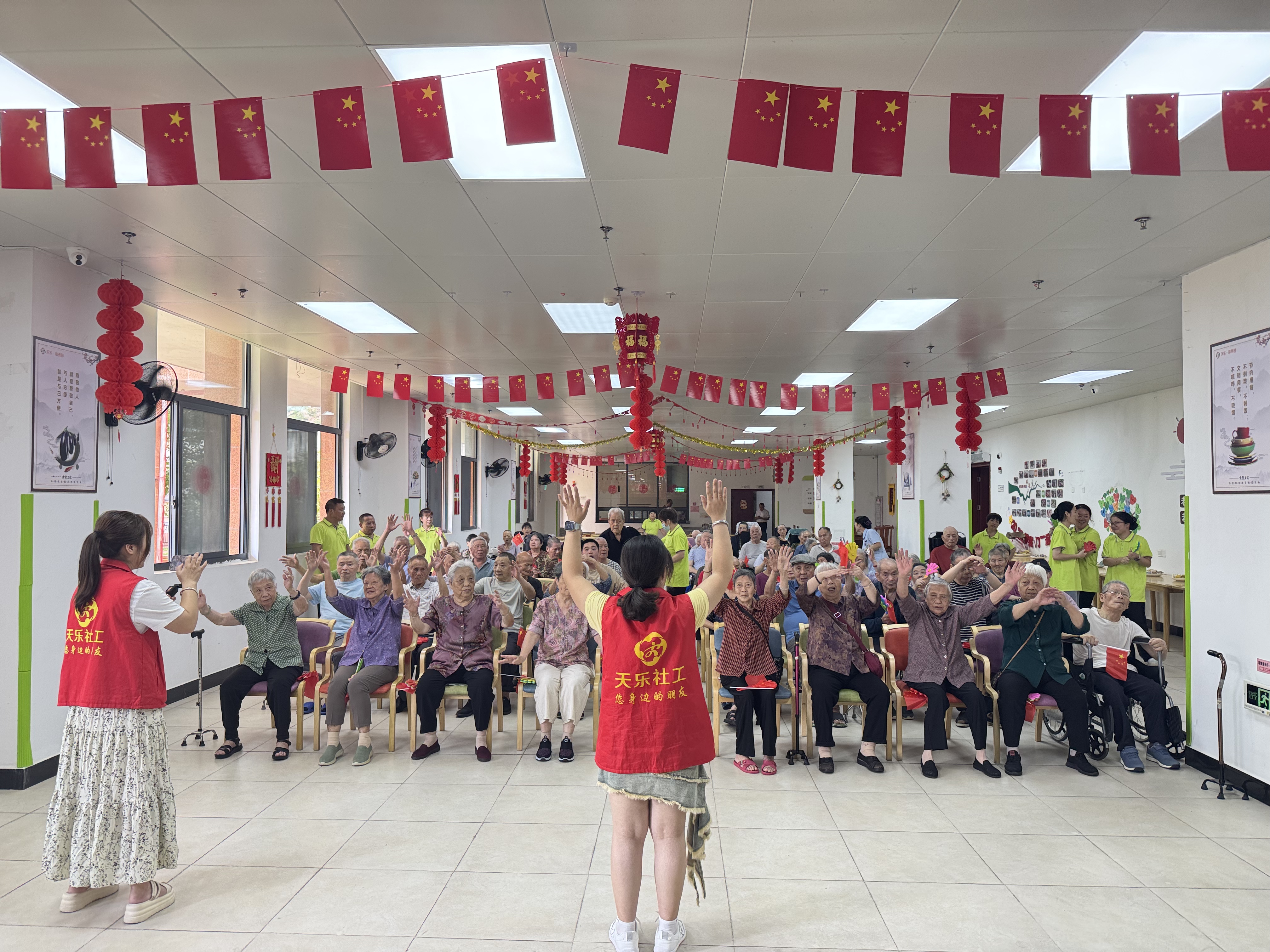 讓老人們頻頻點贊的可不只飯菜這么簡單。每天開飯前半小時,工作人員會組織老人進行一些餐前娛樂活動,紅歌、拍拍操、手語舞,到食堂吃飯,是社區老人固定又期待的日常。