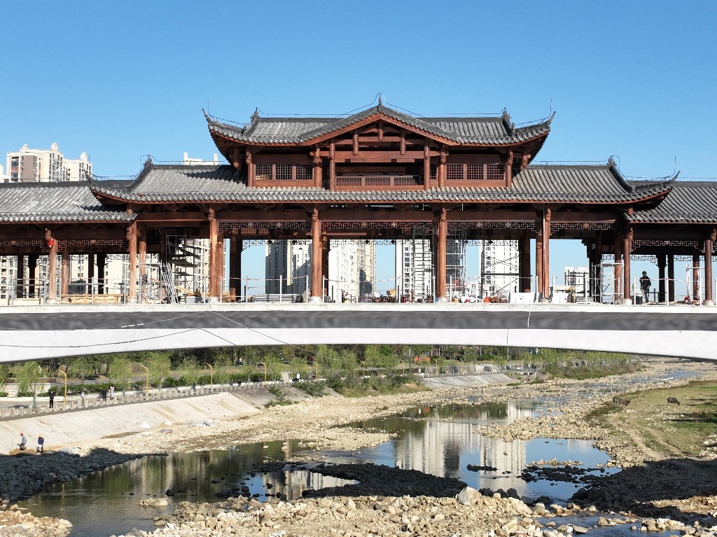 項目現場,幾名工人正細致調整廊下的木質欄桿,一旁的挖掘機停在河岸,顯示配套工程仍在收尾——這座嶄新地標已顯規模,施工重點正轉入廊橋行道及周邊配套工程的完善階段,預計12月上旬即可完工。