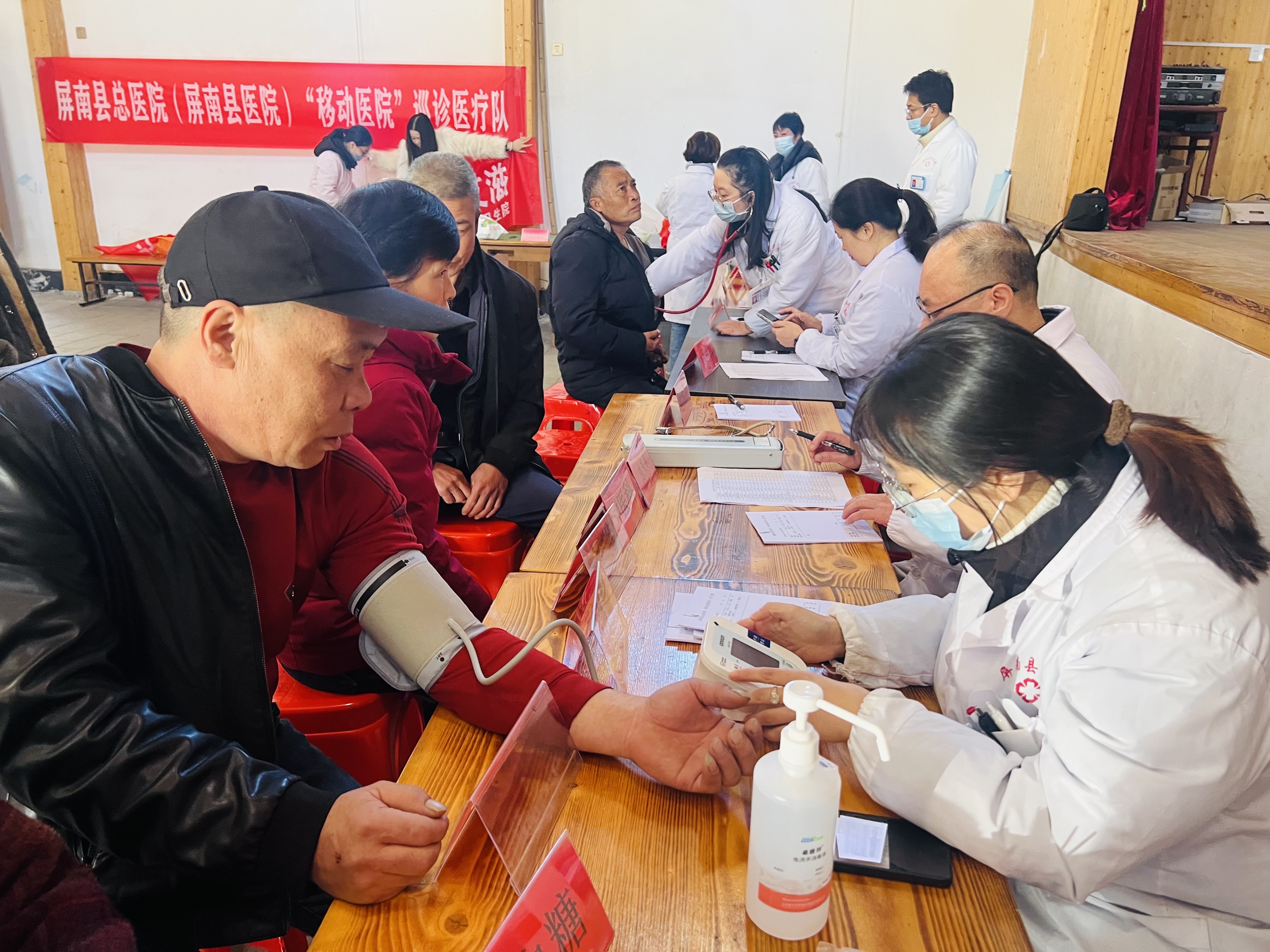 義診現場,屏南縣總醫(yī)院(屏南縣醫(yī)院)“移動醫(yī)院”巡診醫(yī)療隊的10余位專家們正在耐心接診,他們來自呼吸科、五官科、婦產科、骨科等科室。此次活動為村民提供健康咨詢、血壓血糖測量、用藥指導、上門問診等一站式服務,并免費發(fā)放對癥藥品。