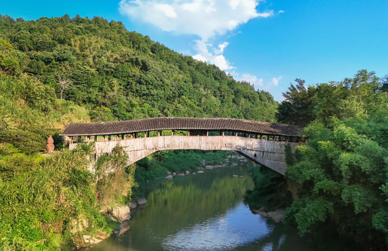 同行中有位對廊橋很有研究的作家,他的目光俯仰在橋梁與廊柱之間,而我被幾位圍坐橋頭的案板邊的老人所吸引,他們臉上和手上的皺紋如古榕皮層般深皺,指尖卻靈便如飛燕,茶葉與花瓣被巧妙撮合與捆扎,動作嫻熟而專注。古廊橋承載著歷史的厚重,見慣了人世的悲歡離合,所幸還有堅守的子民在續寫著生活的新篇,古老的技藝與現代的生活在此交融,醞釀著一絲醉人的溫馨。