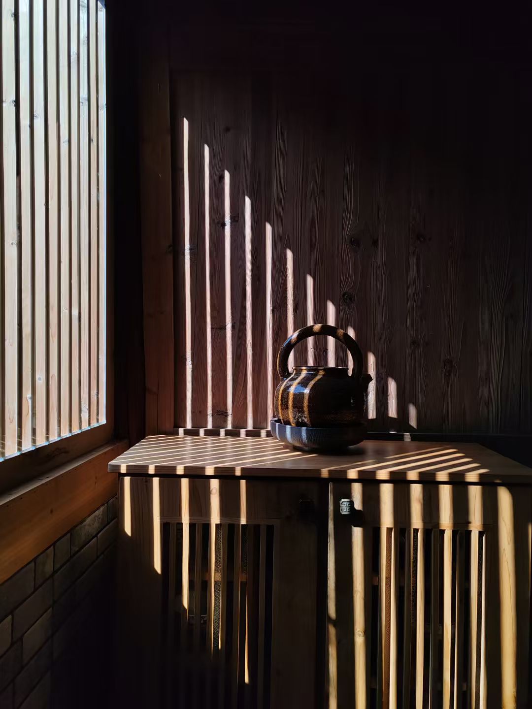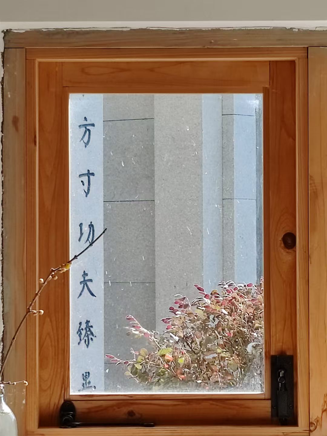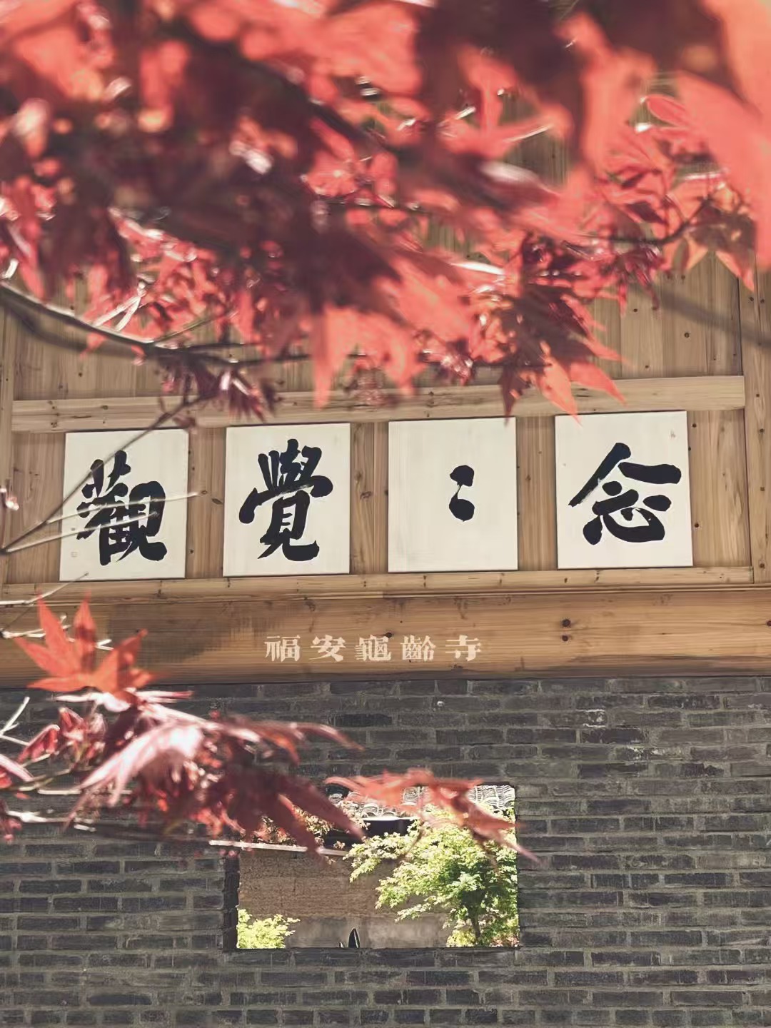 山門(mén)右側(cè)為門(mén)房,入座茶席,透過(guò)左手側(cè)窗戶,可觀寺院往來(lái)人客,山門(mén)內(nèi)側(cè)石柱楹聯(lián)鐫刻有:“方寸功夫”數(shù)字,恰巧與之同框。茶主理人正前方即一僧、一樹(shù)、一墻。禪茶一味一路穿越歷史,透過(guò)長(zhǎng)方形玻璃照進(jìn)了現(xiàn)實(shí),賞茗聞香,舉手投足之間也是修行,從不覺(jué),修得覺(jué)。