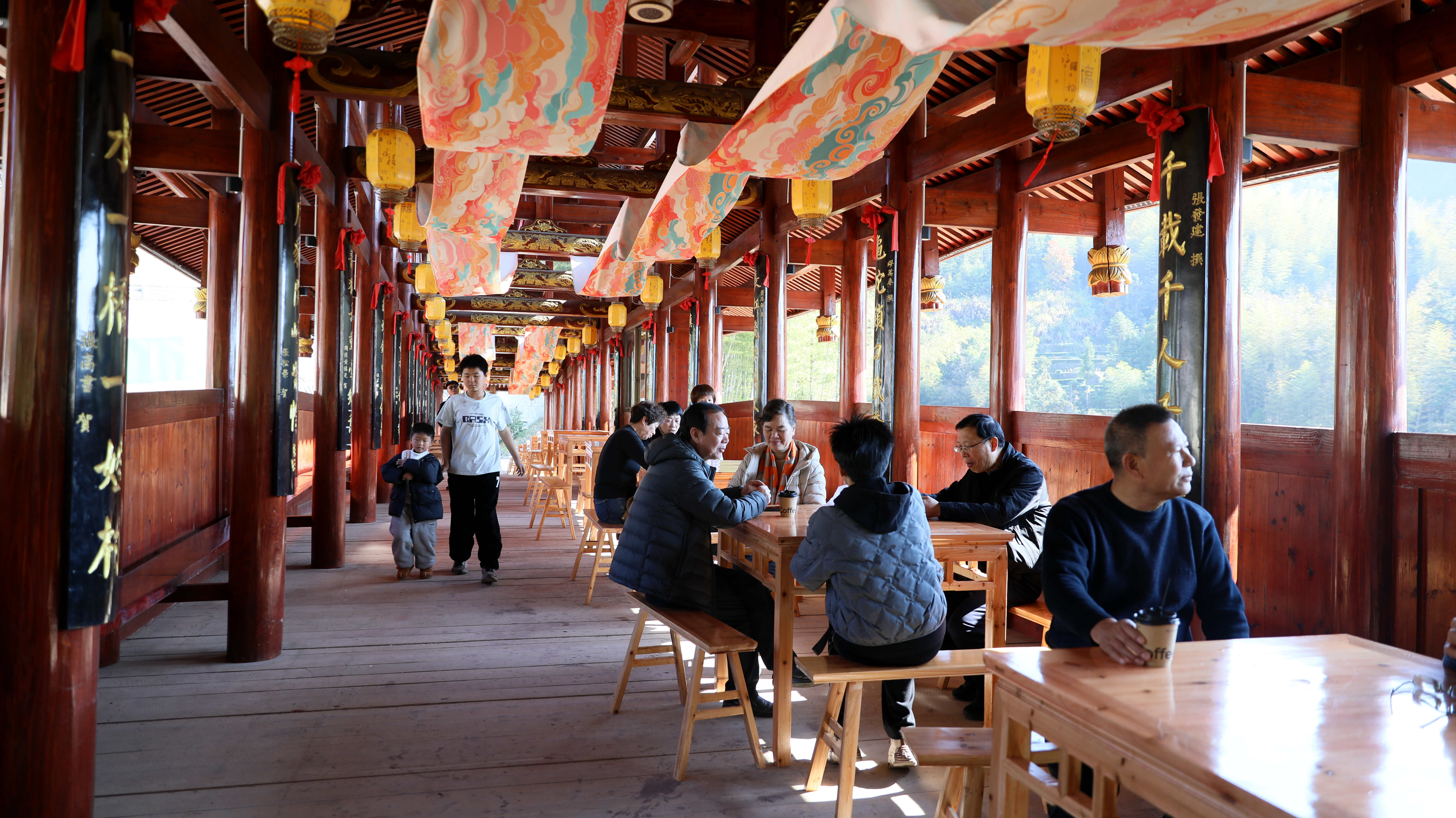 作為村里少有的年輕留守者,村民王明妹與親戚從村委租下廣場旁的木拱廊橋和休閑亭,經營起露天茶館,提供圍爐煮茶、燒烤、團建露營等服務。“試營業半個月,反響挺好,冬至就正式開業!”她語氣里滿是期待。