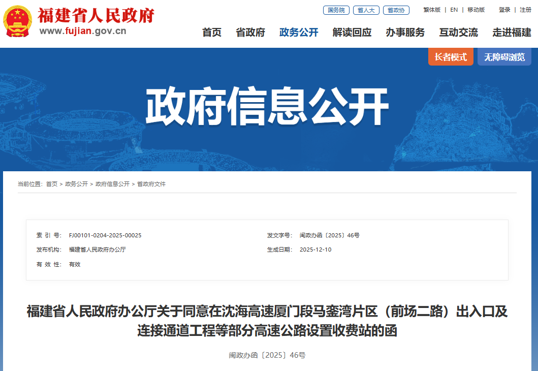 據悉,經省人民政府研究,同意在沈海高速廈門段馬鑾灣片區(前場二路)出入口及連接通道工程設置“廈門馬鑾灣”收費站,在寧武高速鶴山服務區A區出入口工程設置“古田鶴山”收費站,在泉南高速西洋服務區B區出入口工程設置“永安葛福”收費站,在長深高速小橋服務區B區出入口工程設置“建甌甘源茶宿”收費站。收費站的建設必須符合國家、省關于公路收費站的相關要求,經驗收合格后,方可投入使用。