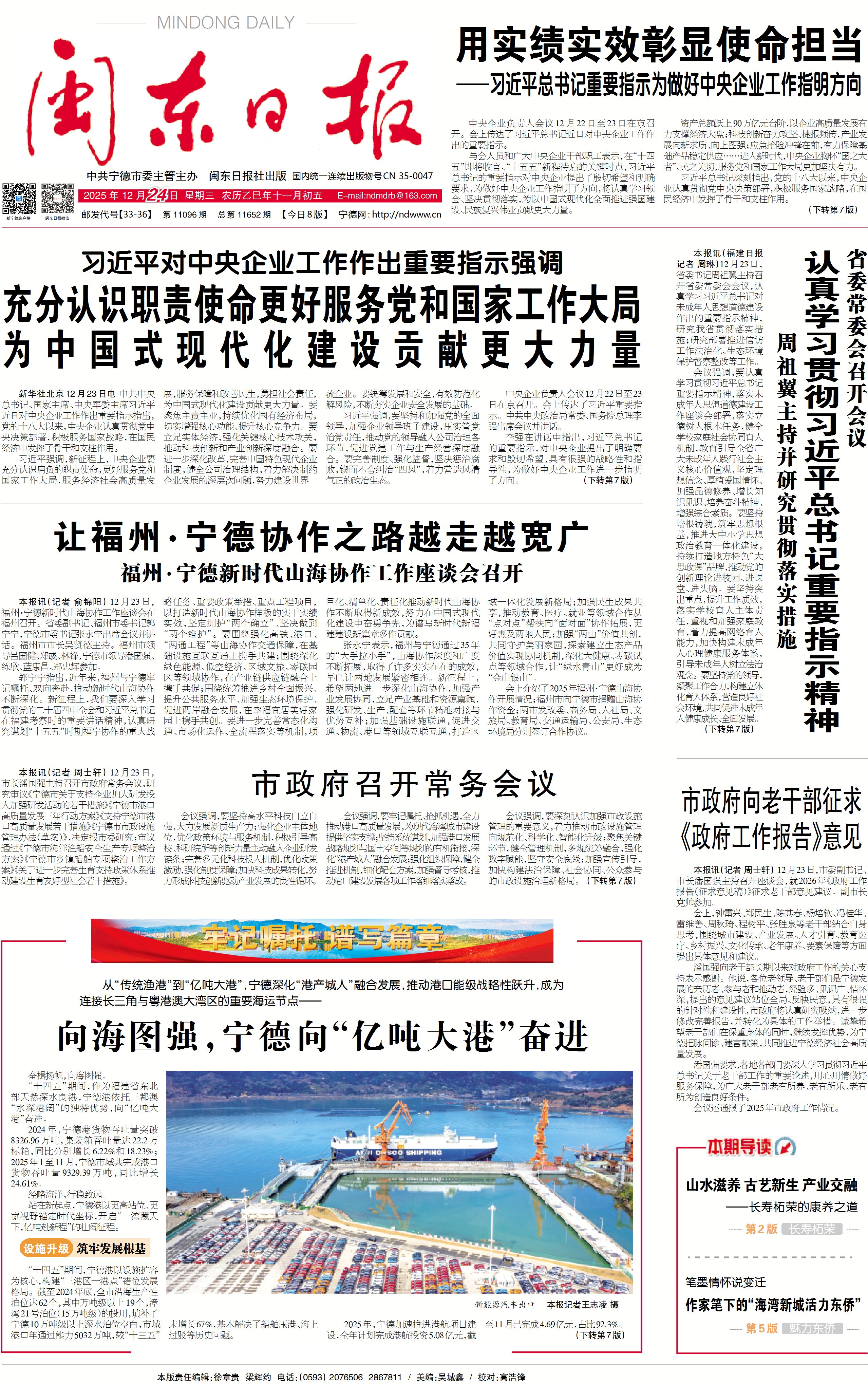 2024年,寧德港貨物吞吐量突破8326.96萬噸,集裝箱吞吐量達(dá)22.2萬標(biāo)箱,同比分別增長6.22%和18.23%;2025年1至11月,寧德市域共完成港口貨物吞吐量9329.39萬噸,同比增長24.61%。經(jīng)略海洋,行穩(wěn)致遠(yuǎn)。