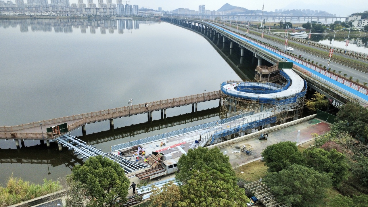 據了解,金馬大橋步道與南岸公園棧道是許多市民慢跑、散步的好去處,然而步道與棧道之間的連接點較少,僅有一處樓梯,人多時易擁擠。隨著環(huán)東湖及周邊景觀提升工程的啟動,此處增設一處旋轉樓梯,樓梯寬約3米,長約140米。完工后,不僅實現“無障”暢行,也將成為新的觀景打卡平臺,提升市民游覽體驗。