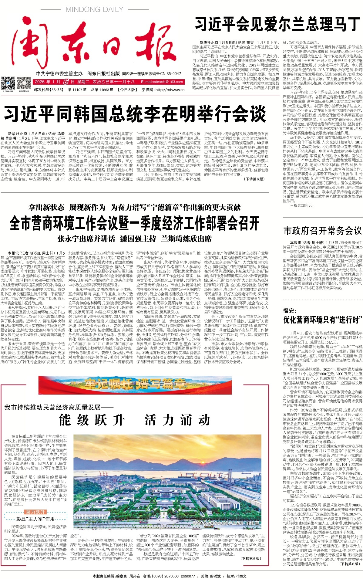 潘國強強調(diào),要聚焦“開局起勢、實績檢驗”主題要求,進一步優(yōu)化營商環(huán)境,全力推動寧德經(jīng)濟運行提質(zhì)增效,確保一季度起好步開好局。要抓好經(jīng)濟運行穩(wěn)增長,強化對經(jīng)濟運行的跟蹤、分析和協(xié)調(diào);抓好關(guān)鍵節(jié)點促消費,把握好春節(jié)、元宵等重要節(jié)點,融合線上線下渠道,整合“農(nóng)文旅體商”資源,大力推進提振消費春季行動,不斷提高政策兌現(xiàn)精準度和消費者參與便利度;抓好項目攻堅擴投資,加強項目謀劃和開竣工管理,協(xié)同推進制造業(yè)、基礎(chǔ)設(shè)施、房地產(chǎn)等領(lǐng)域項目建設(shè);抓好產(chǎn)業(yè)增效強支撐,扎實推進春糧和農(nóng)經(jīng)作物生產(chǎn),推動工業(yè)企業(yè)穩(wěn)產(chǎn)增產(chǎn),大力發(fā)展現(xiàn)代服務(wù)業(yè),同時實施“招商突破年”活動,加強與在外鄉(xiāng)賢溝通聯(lián)絡(luò),積極策劃“走出去”招商;抓好服務(wù)保障促落實,強化政策要素保障,深入開展“益企寧德”大走訪活動;抓好困難幫扶保民生,全力以赴穩(wěn)就業(yè),做好市場保供穩(wěn)價、春運出行、困難群體走訪幫困等民生服務(wù);抓好安全穩(wěn)定守底線,深化海上船舶、道路交通、高層建筑等安全生產(chǎn)重點領(lǐng)域治理,加強生態(tài)環(huán)保、社會治安、文物安全等風險隱患排查整治,確保社會大局和諧穩(wěn)定。