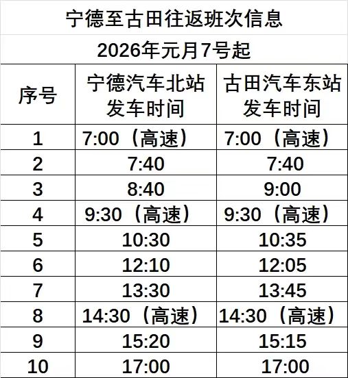 試運行期間,新增的3個全程高速班次,安排如下:寧德汽車北站發車時間:7:00、9:30、14:30;古田汽車東站發車時間:7:00、9:30、14:30。票價方面,根據票價核定相關規定,全程高速票價核定為50元/人全票。