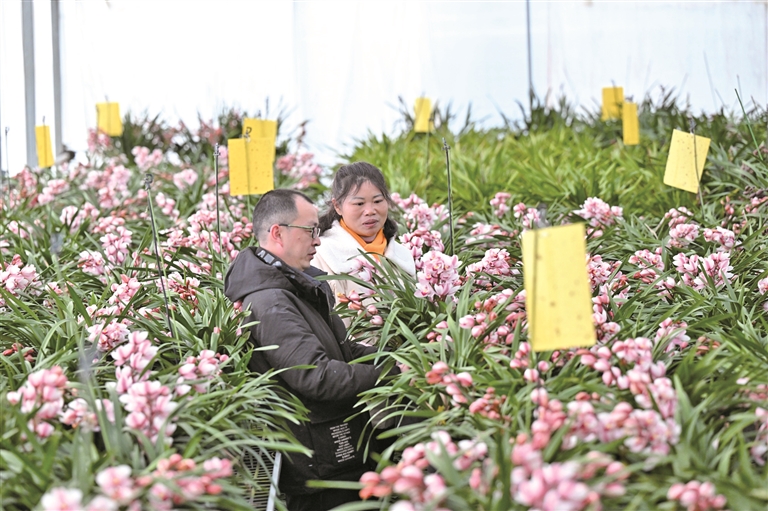 1月14日,在位于周寧縣浦源鎮的寧德向山蘭園植物科技有限公司花卉大棚內,周寧縣花卉辦工作人員(左)與企業管理人員查看大花惠蘭長勢。