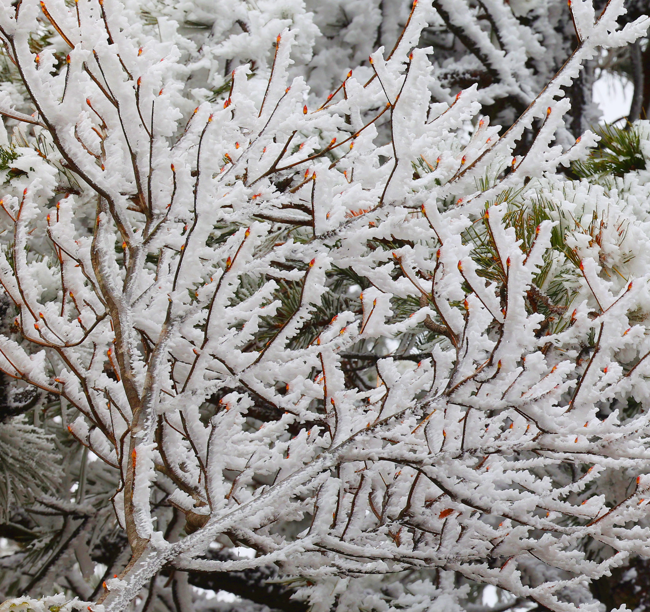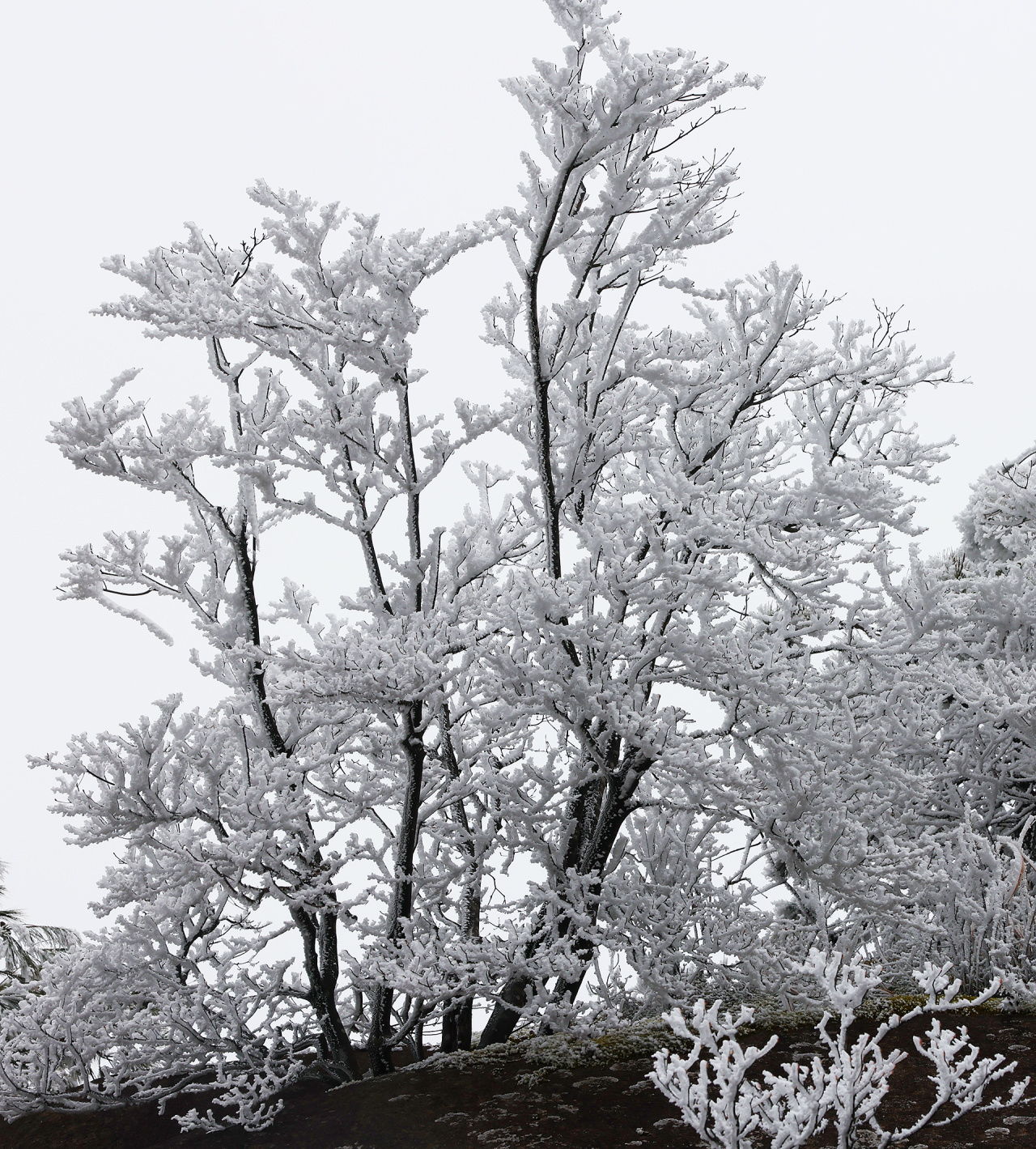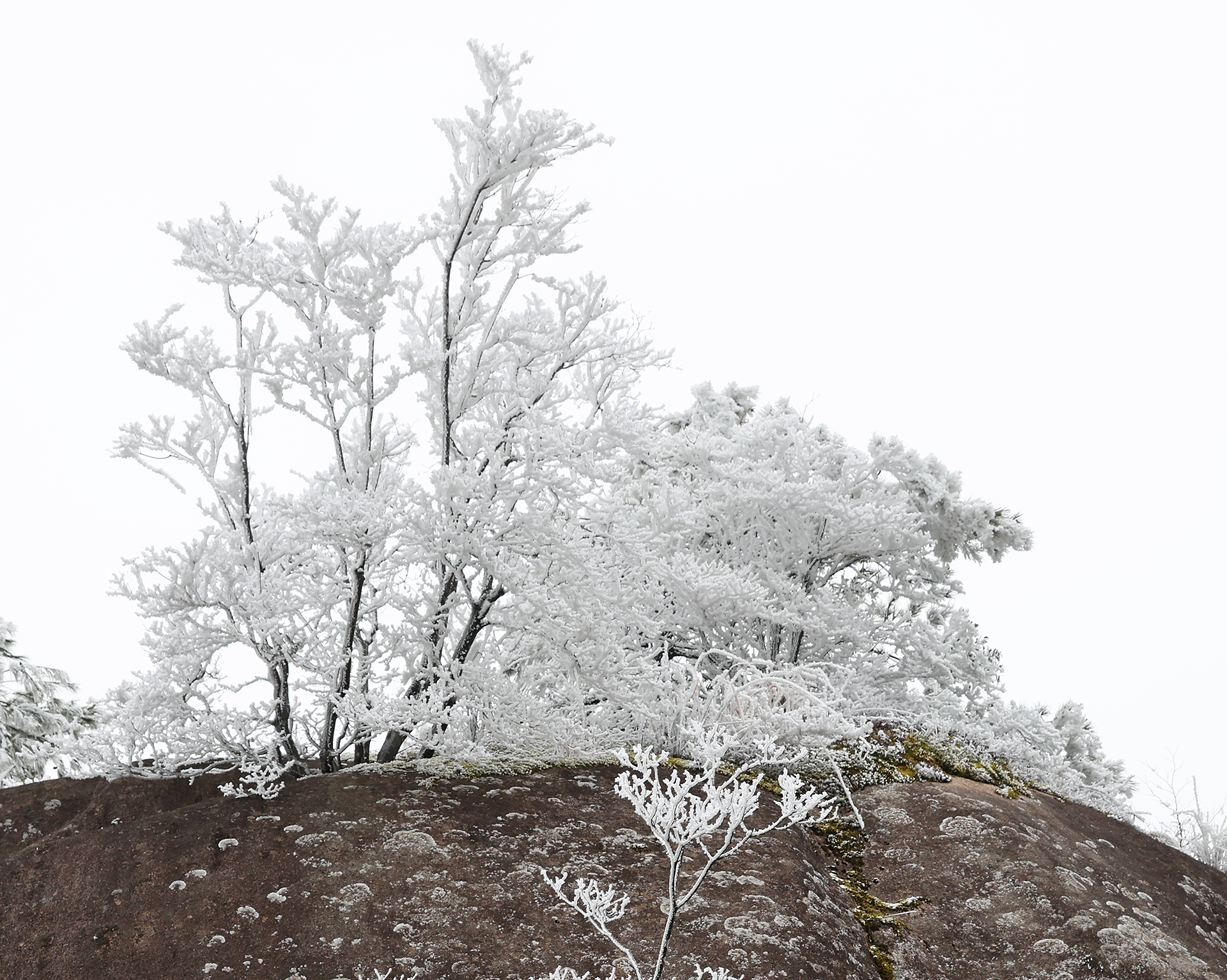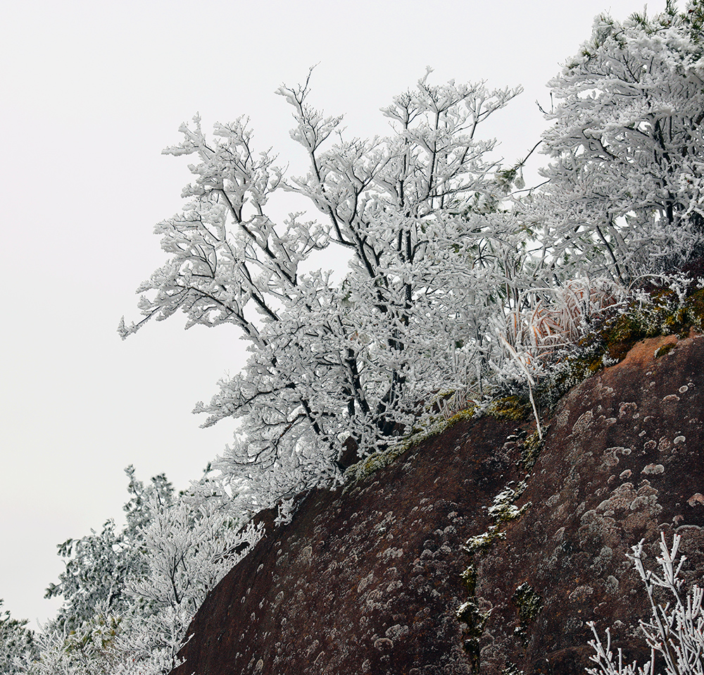 低溫濕冷的天氣,給雙苗尖悄悄披上了一層潔白的輕紗。松樹與灌木仿佛一夜之間開出了玉樹瓊花,美得令人屏息;樹枝上、野果上、葉片上、草叢間,凝結(jié)著晶瑩的霧凇;地面的土層在凍脹作用下,也鉆出了一針針細(xì)長的冰晶。在鏡頭下,這些自然雕琢的細(xì)節(jié)被放大,仿佛走進(jìn)了一個(gè)靜謐而奇幻的冰雪世界。