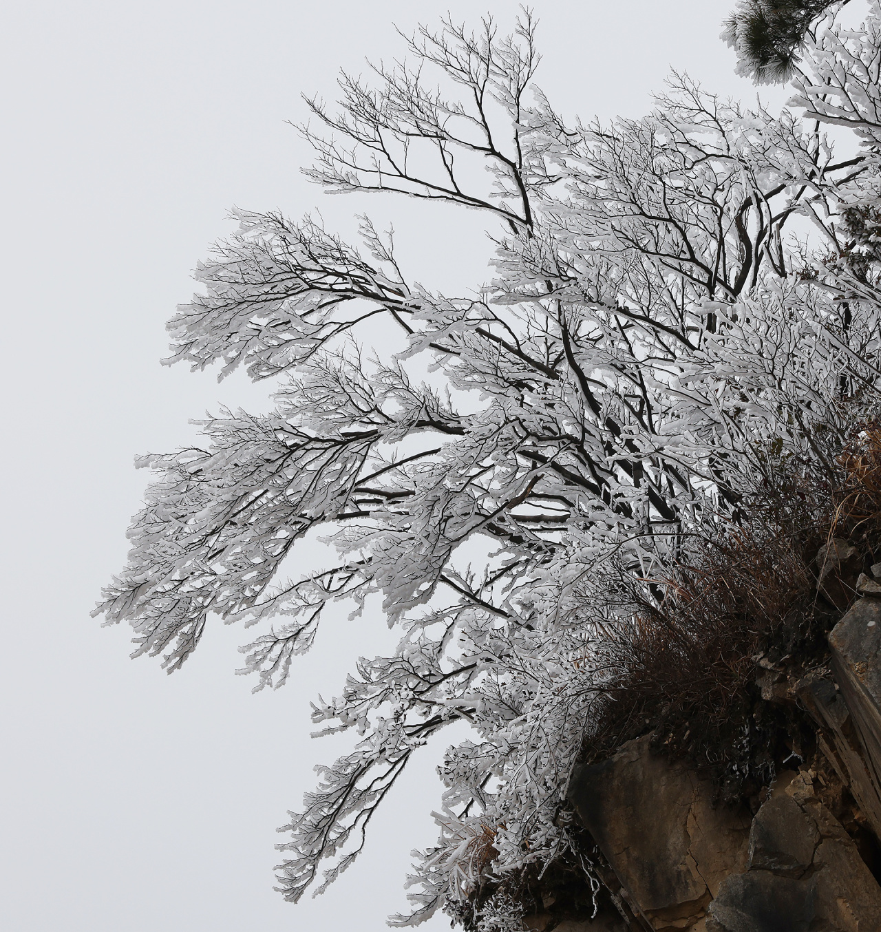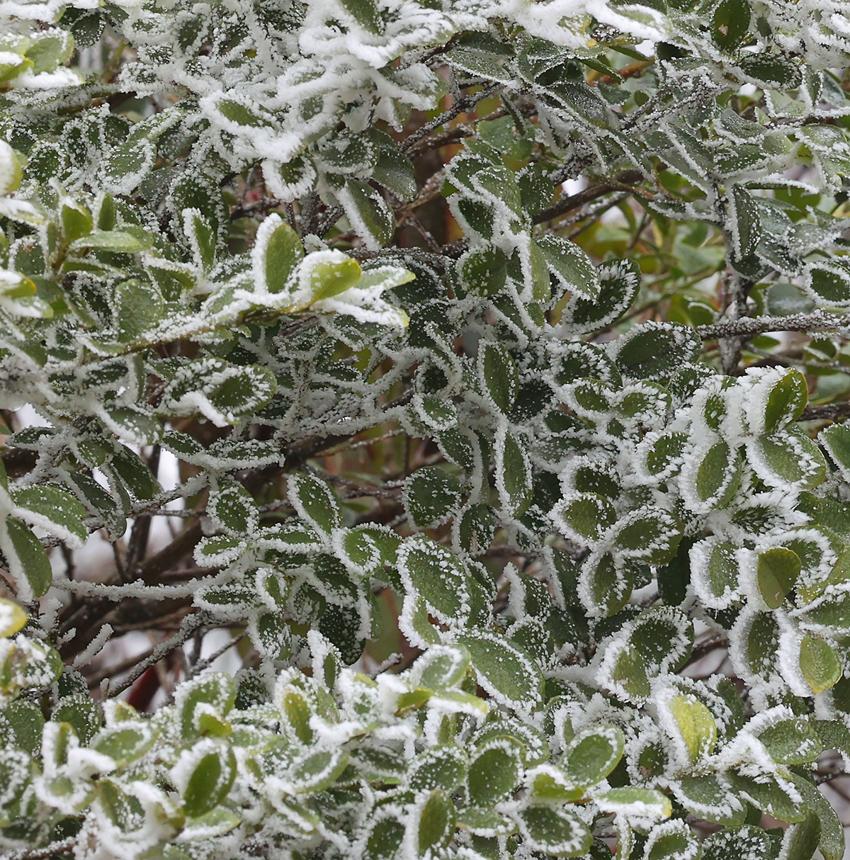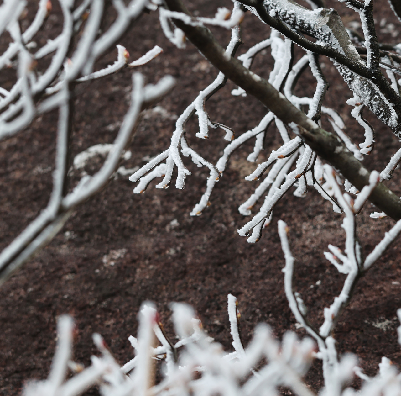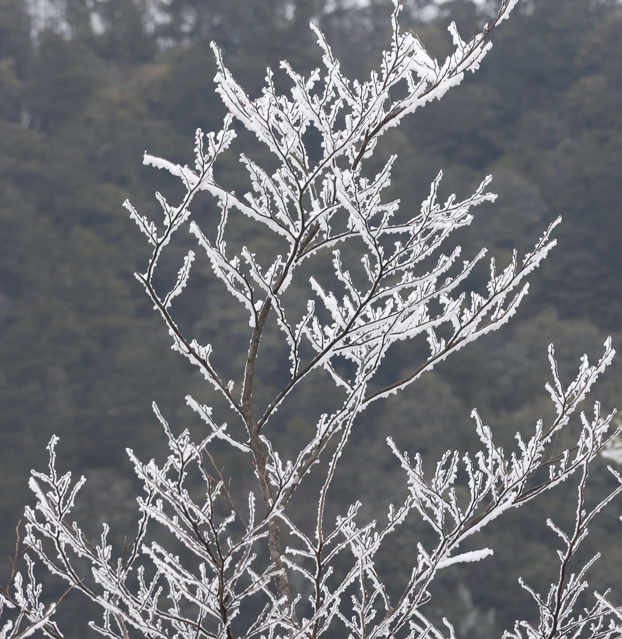 低溫濕冷的天氣,給雙苗尖悄悄披上了一層潔白的輕紗。松樹與灌木仿佛一夜之間開出了玉樹瓊花,美得令人屏息;樹枝上、野果上、葉片上、草叢間,凝結(jié)著晶瑩的霧凇;地面的土層在凍脹作用下,也鉆出了一針針細(xì)長的冰晶。在鏡頭下,這些自然雕琢的細(xì)節(jié)被放大,仿佛走進(jìn)了一個(gè)靜謐而奇幻的冰雪世界。